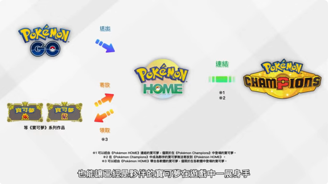 此外本作已確定會與《Pokémon HOME》互相連結,玩家不僅能在《Pokémon Champions》中讓寶可夢成為夥伴,也能讓已經是夥伴的寶可夢在遊戲中一展身手,需注意的是可以經由《Pokémon HOME》連結的寶可夢僅限於在《Pokémon Champions》中登場的寶可夢,相關的注意事項可從影片當中確認,關於《Pokémon Champions》的上線日期敬請期待官方後續消息。