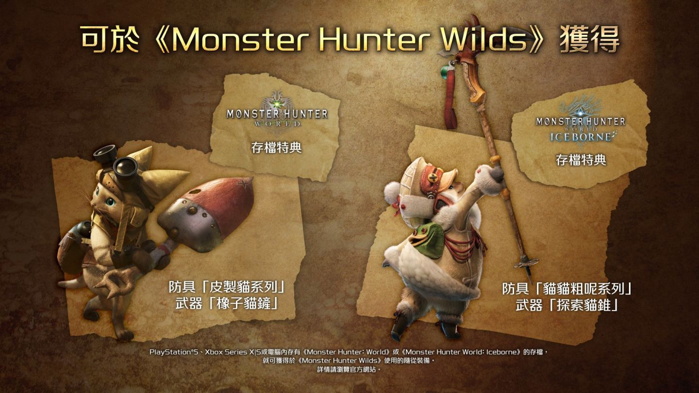 ・存檔特典:若您擁有《Monster Hunter World》或《Monster Hunter World:Iceborne》之存檔,將可在《Monster Hunter Wilds》內獲得「隨從艾路裝備」及「獵人簡介的名牌」。