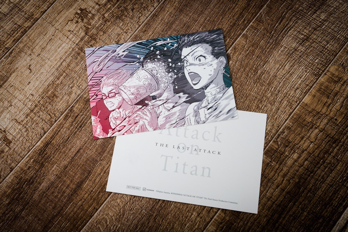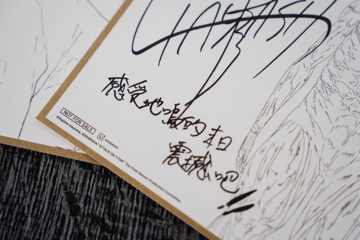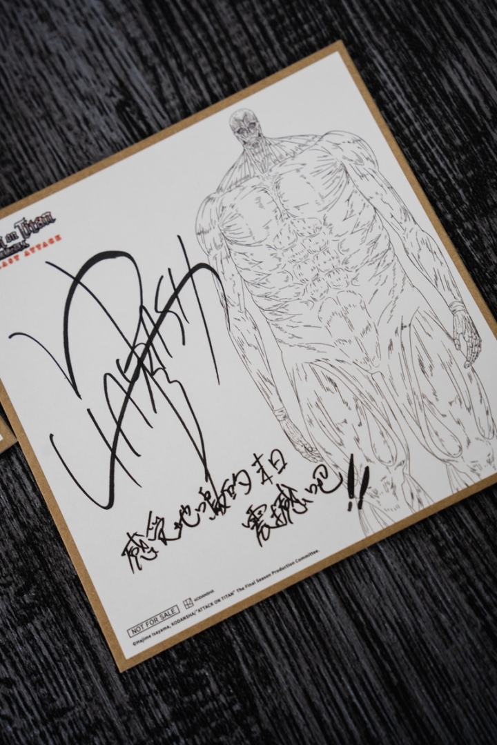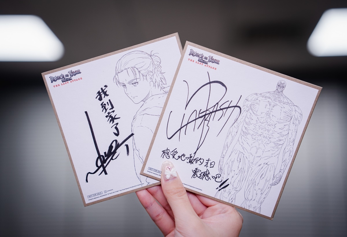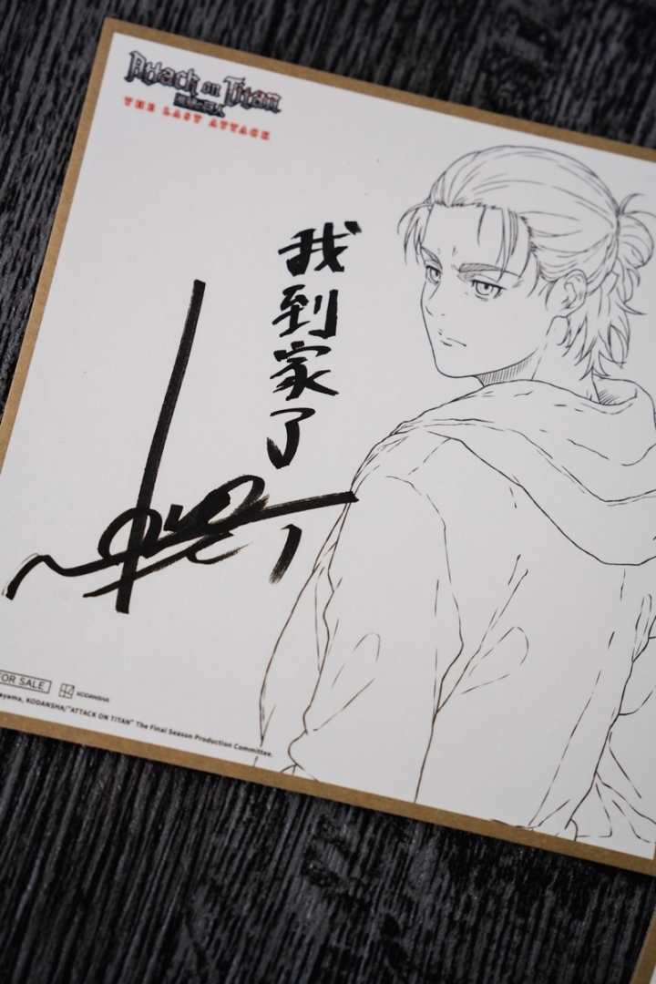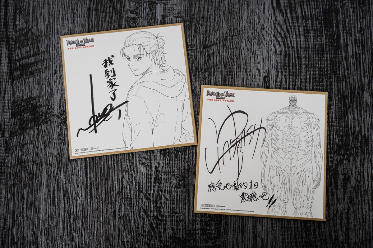 其中「林祐一郎」導演的簽名版寫下「感受地鳴的末日震撼吧!!」,艾連聲優「梶裕貴」則親筆留下「我到家了」四個字,讓許多不捨艾連結局的鐵粉直接淚崩。兩款限定複製簽名板將隨機發送,勢必掀起影迷間的收藏熱潮。