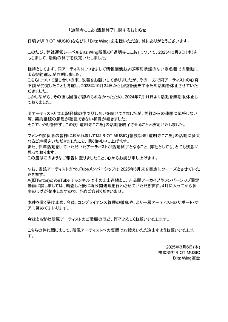虛擬藝人經紀公司 RIOT MUSIC 於今(6)日宣布,旗下音樂品牌「Blitz Wing」所屬虛擬歌手「道明寺可可亞」(道明寺ここあ)正式結束活動,並在聲明中說明事情的來龍去脈。