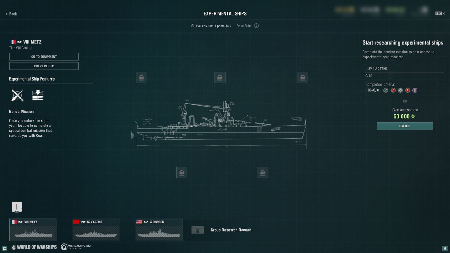 全新機制和試驗型戰艦也將於 14.2 版本更新中登場。試驗型戰艦為遊戲帶來獨特的機制和玩法,而第一組的三艘試驗型戰艦分別為 VIII Metz、IX Vyazma 和 X Oregon。試驗型戰艦主要是為資深玩家而設計,玩家需要完成特殊任務才能獲得研發的資格。