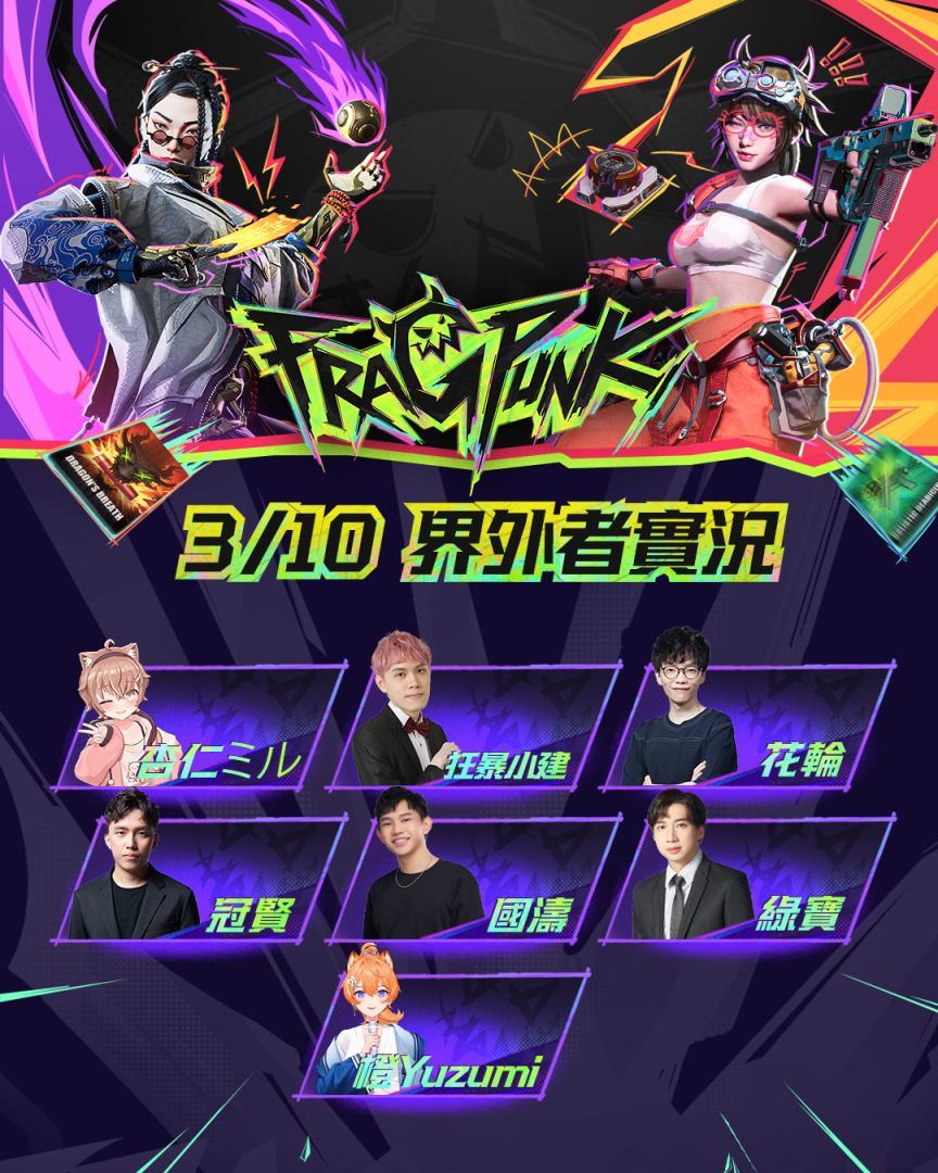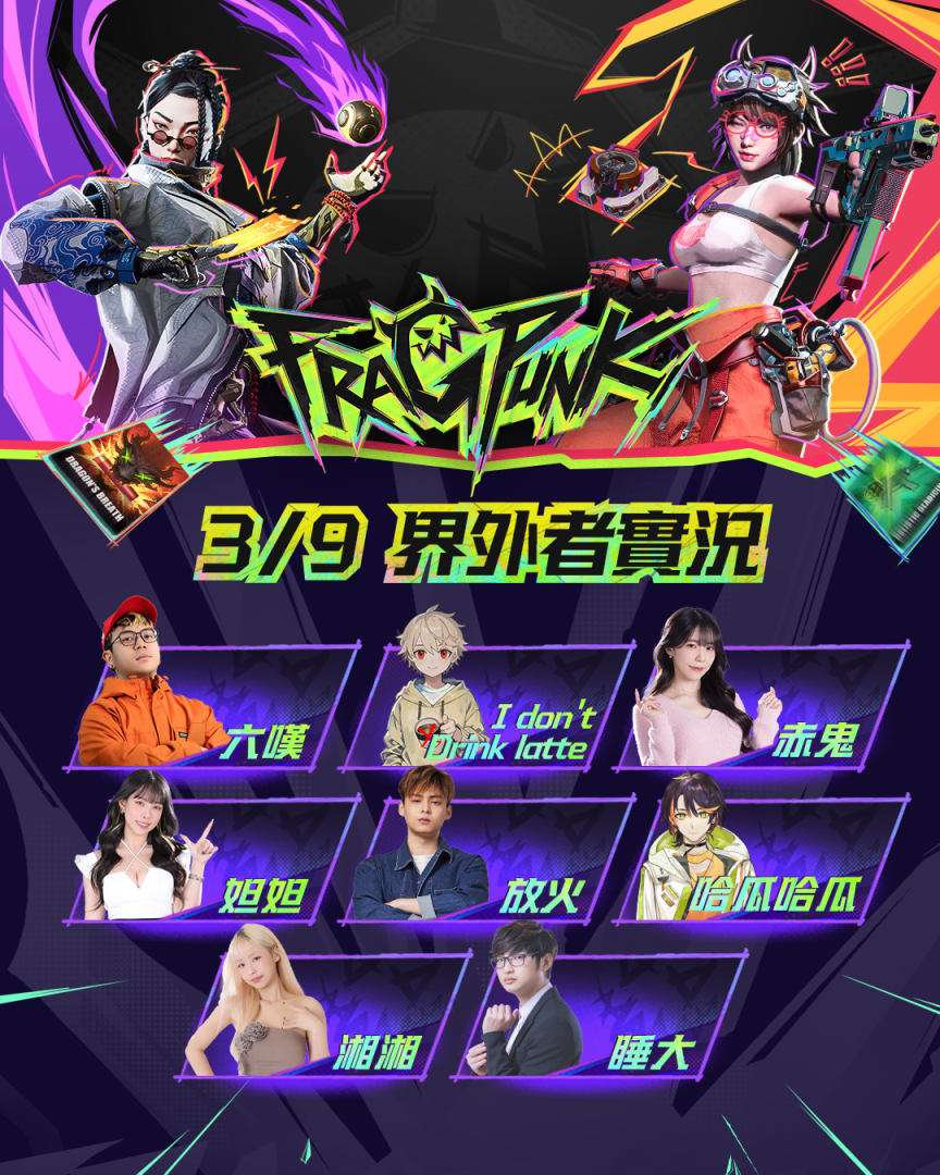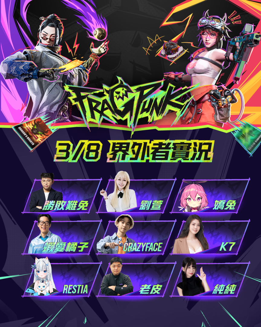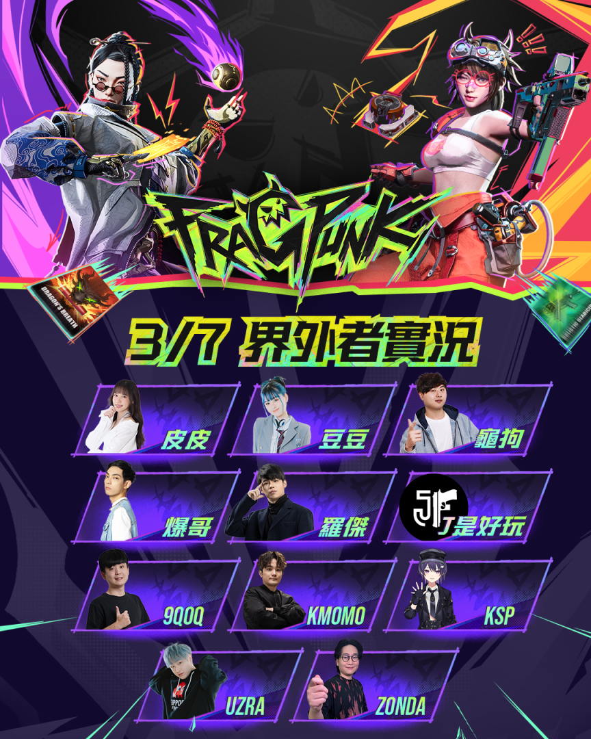 《FragPunk》邀請超過 50 位知名 KOL 與頂尖實況主,全程陪伴玩家挑戰界外戰場!來自各大 FPS 領域的強者齊聚一堂,包括哈耿、家偉、龜狗、Krapy、CrazyFace、KMomo 等實力高手,無論是想學習頂級射擊技巧,還是掌握碎片卡的應用機制,都能在他們的直播中獲得第一手戰略資訊,甚至還有機會與他們正面對決,一較高下!