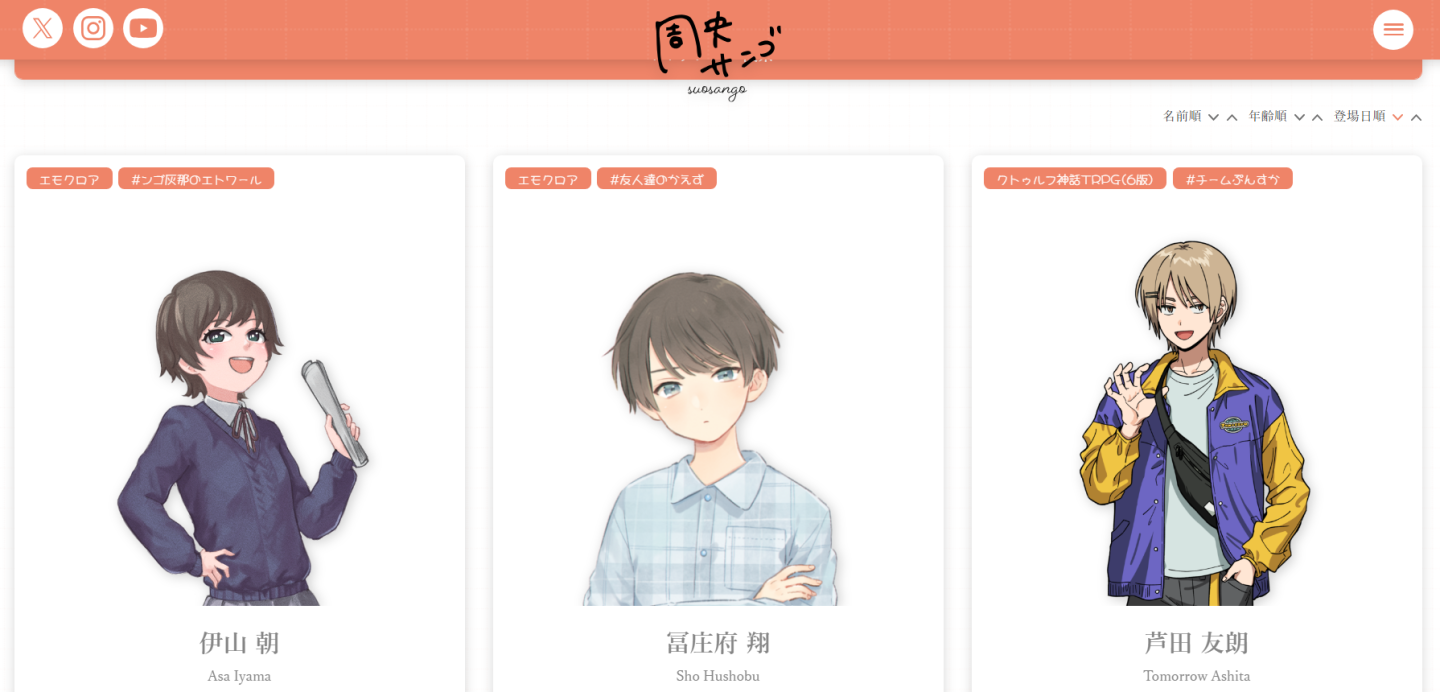 每位角色皆附有基本資料、登場直播的連結,若該角色有專屬插圖,也會標註繪師的名稱,內容相當豐富;需要注意的是,該官方網站由周央珊瑚本人親自管理,因此更新頻率不固定,周央珊瑚也在公告中表示「TRPG 角色一覽等部分內容尚未完全整理,但希望大家能把這裡當成一個大致了解我的網站,輕鬆享受就好!」