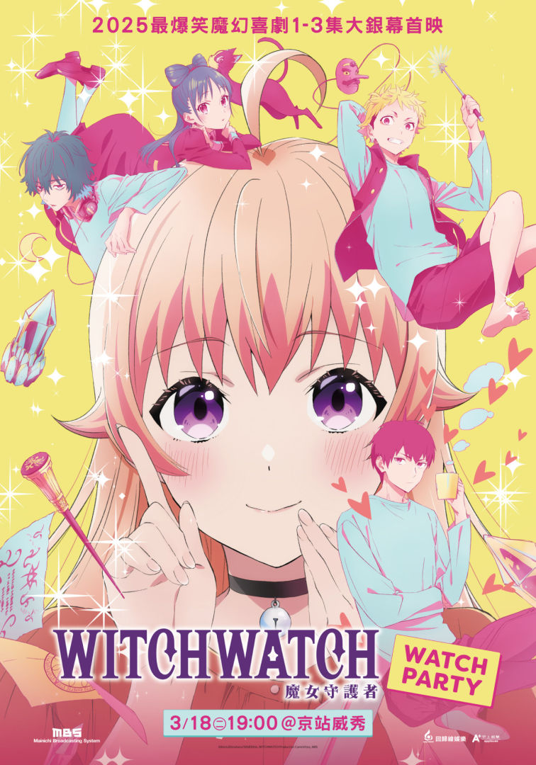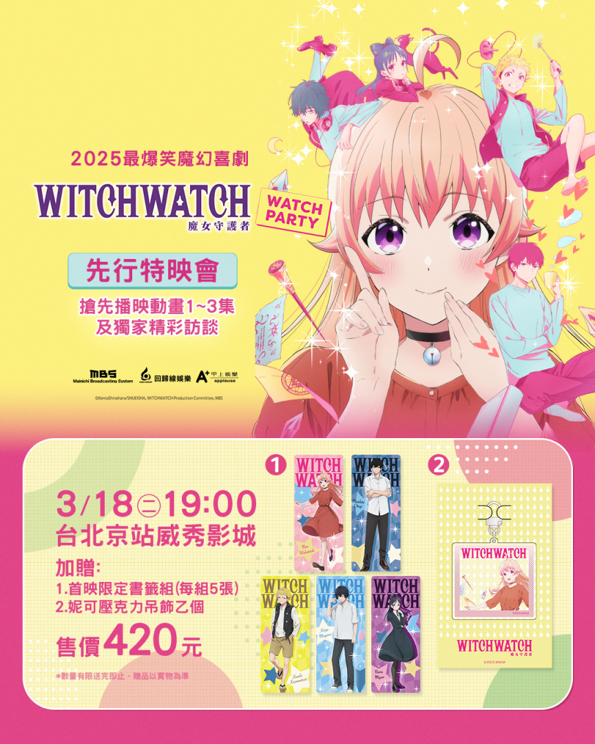 這部由日本漫畫家篠原健太創作的魔法喜劇大作,故事講述「魔女」妮可以及「鬼之後裔」守仁一連串異想天開、超爆笑的同居生活,3 月起將大規模在台灣、香港、新加坡、馬來西亞、泰國等地舉辦全球「先行特映會」,第一站從台北起跑,3 月 18 日於台北京站威秀影城登場,讓喜愛《Witch Watch 魔女守護者》的粉絲可以搶先看 3 集,並加碼聲優與導演獨家精采訪談影片。