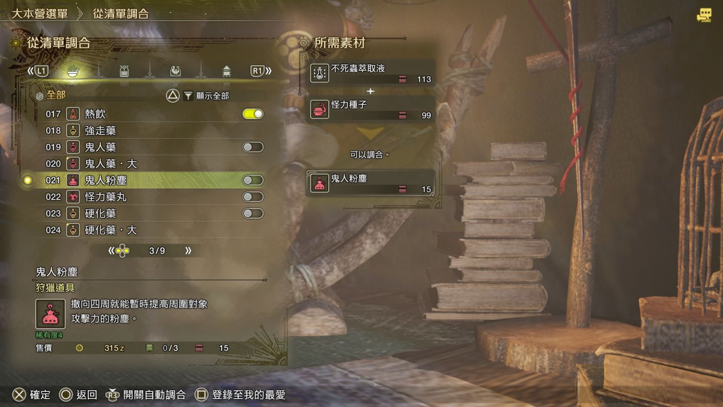 | 鬼人藥 | 提升攻擊力 | 戰鬥前使用,提升輸出 |
