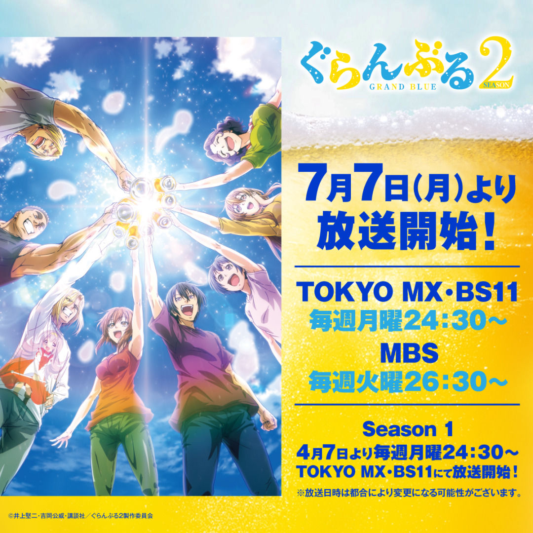 改編自井上堅二 x 吉岡公威原作漫畫的電視動畫《GRAND BLUE 碧藍之海》(ぐらんぶる),於今(6)日宣布第二季將於 7 月 7 日播出,主題曲〈青春永遠〉由湘南乃風 feat.新學校領袖獻唱。
