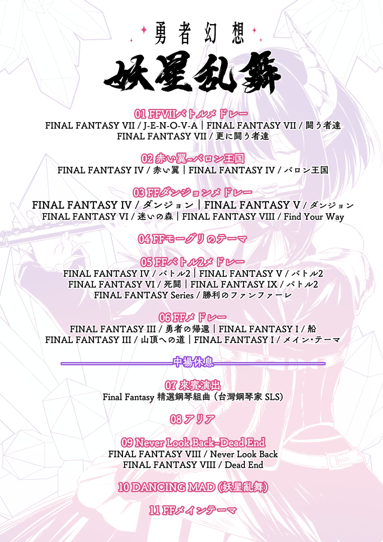 本場音樂會精選《Final Fantasy》系列多首曲目,透過管樂改編形式,重現遊戲內的戰鬥、地下城探索與 Boss 決戰場景,帶領觀眾沉浸於奇幻的勇者世界!