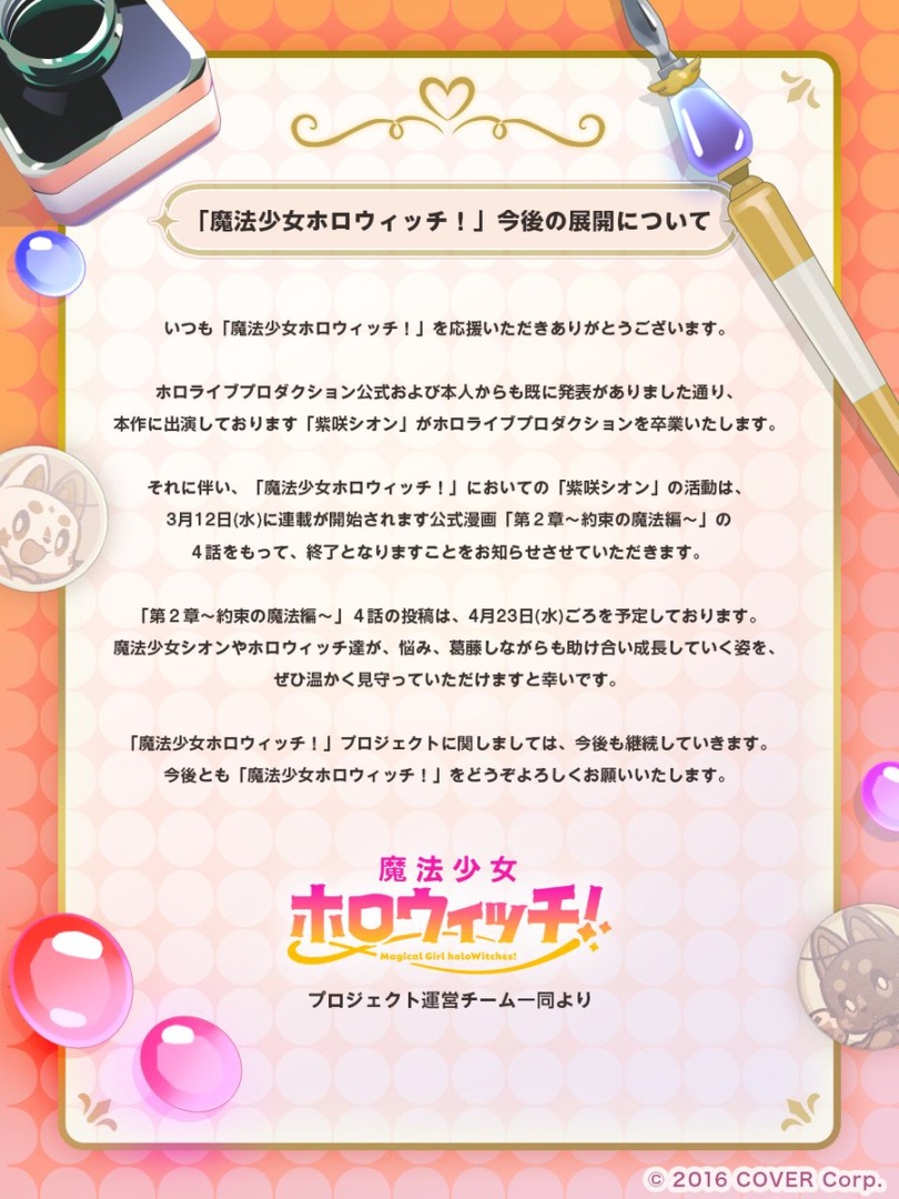 虛擬偶像團體 hololive 旗下多媒體企劃「魔法少女 holoWitches」(魔法少女ホロウィッチ!)於今(11)日對於所屬成員紫咲詩音(紫咲シオン)的畢業和企劃未來發展發表聲明。