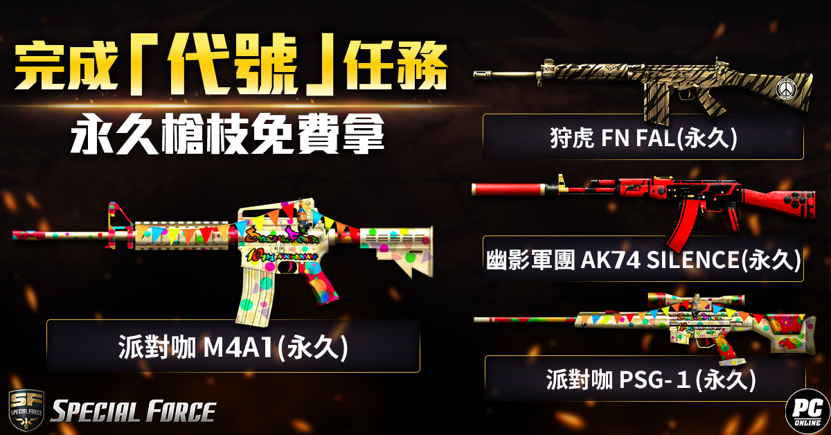 開服活動中,將舉辦限時「代號:S、F、O、B」的四項活動,玩家只要達成指定任務條件,即可獲得包含永久槍枝「狩虎 DOUBLE WINCHESTER」、「狩虎 FN FAL」、「派對咖 M4A1」、「派對咖 PSG-1」,以及各 80 枚的「SP 轉蛋幣」與「CASH 轉蛋幣」等獎勵。此外,若完成四項活動內的所有任務,還可再得額外的永久槍枝「幽影軍團 AK74 SILENCE」,以及絕版「樂意專屬勳章」。