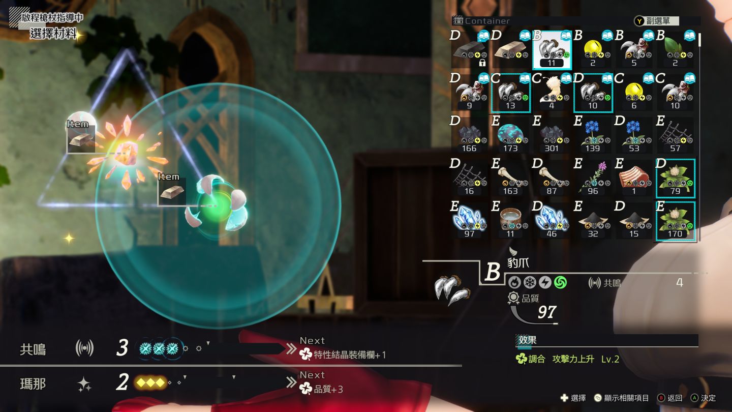 鍊金系統的操作方式使用了《萊莎》的材料環,同一屬性與類別的素材會引發更強的「共鳴」範圍,就能投入更多素材,加上每個道具都用更明現的「效果」、「品質」「特殊能力」等核心去引導玩家,因此入門性來說又比以往更親切一點,當然懶人玩家還是可以採用最低限度成果、品質、效果的自動鍊金。
