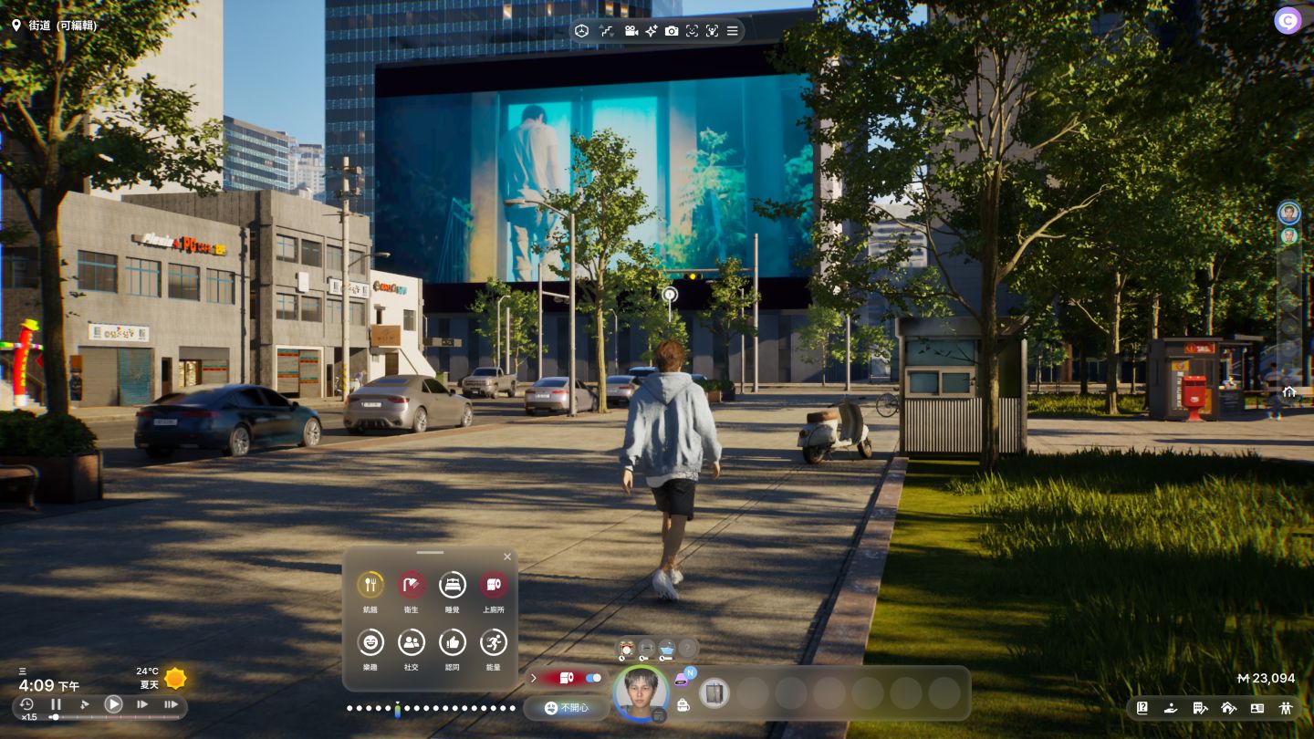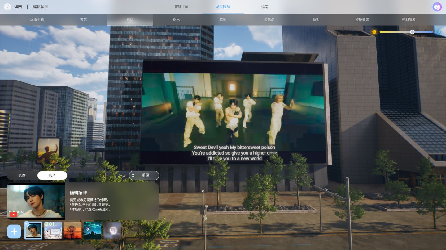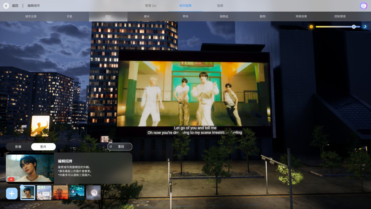 在設定介面的「城市裝飾」>「標誌」裡面,玩家可以自由在《inZOI》的指定大樓外牆更換自己想要的外觀,可以掛最多 3 張的靜態圖片,甚至是...掛上 YouTube 影片讓他 24 小時輪播。一秒無痛 Get 到免費的戶外應援。不管在哪個角度,不管哪個時間點,通通都能清楚看見......太值得了。未來如果有開放地鐵的話,請務必連地鐵內建螢幕、包牆柱都準備一下吧!