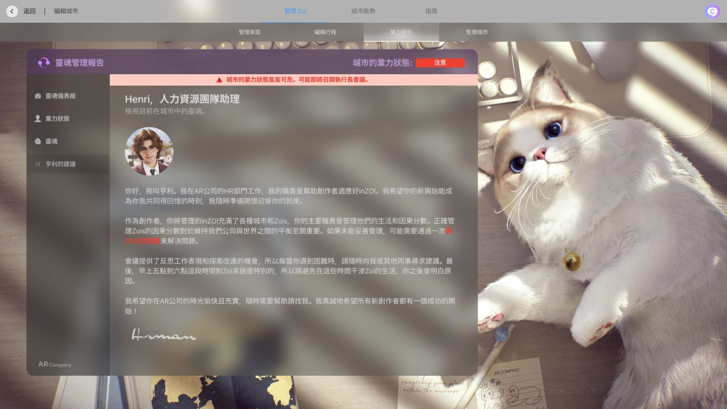 《inZOI》設定在一個平行虛擬世界,看起來很像地球,但不是地球。你是 AR COMPANY 的菜鳥實習生,平常除了扮演《inZOI》世界的上帝,觀察世界裡面「Zoi」的一舉一動,剩下時間就是當一名安分守己的社畜,凡事與部門主管、執行長回報。