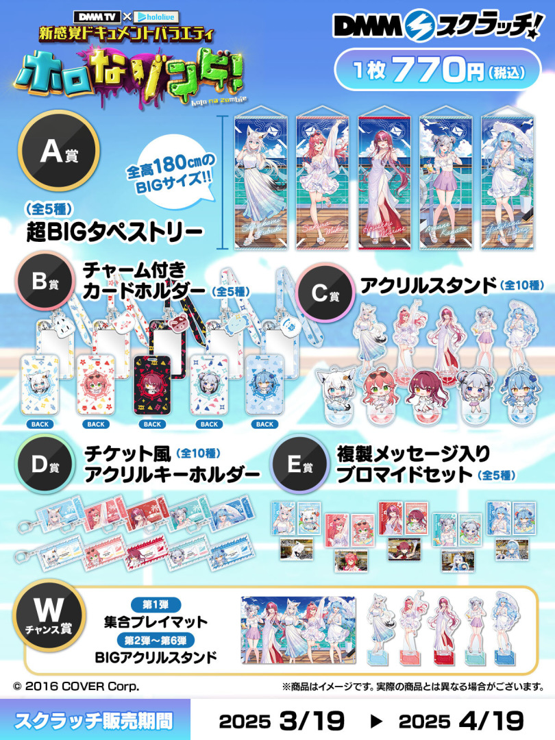 除了緊張刺激的節目內容以外,DMM 也將推出以該節目主視覺圖為主的特別刮刮樂活動,獎品陣容包含大型掛軸/附吊飾卡夾/壓克力立牌/票卷風壓克力鑰匙圈/含複製簽名照片組,雙重機會獎則可獲得大型桌墊或大型壓克力立牌等,喜歡參與本節目 hololive 成員的粉絲們不要錯過!