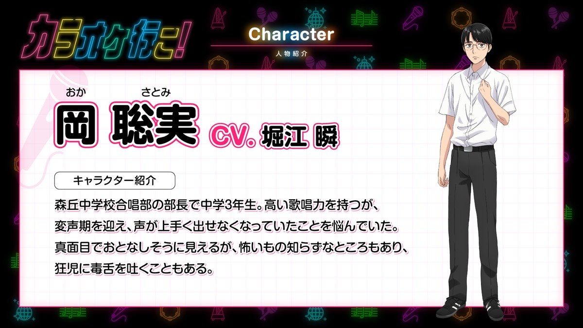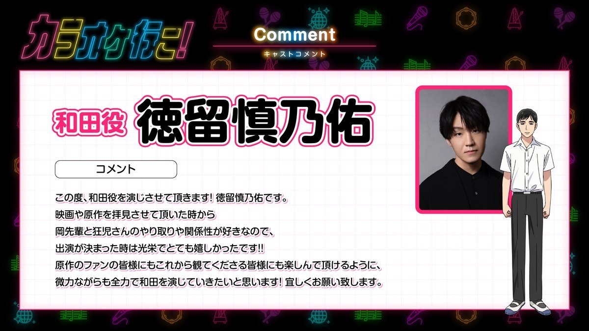 此外《去唱卡拉OK吧!》中岡聰實的合唱團後輩.和田將由徳留慎乃佑飾演,並將會在 4/1 岡聰實生日紀念直播節目中和堀江瞬兩人一起出演。