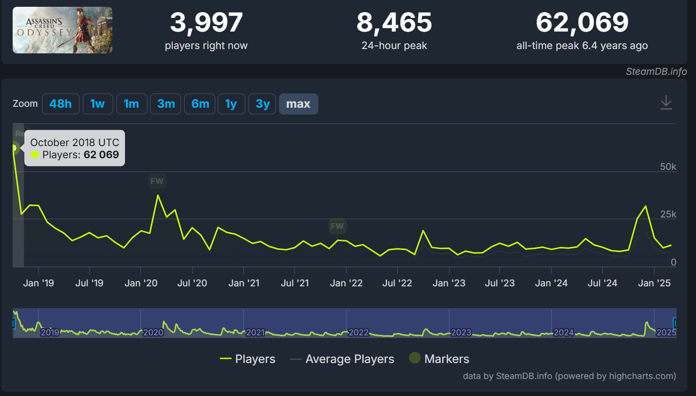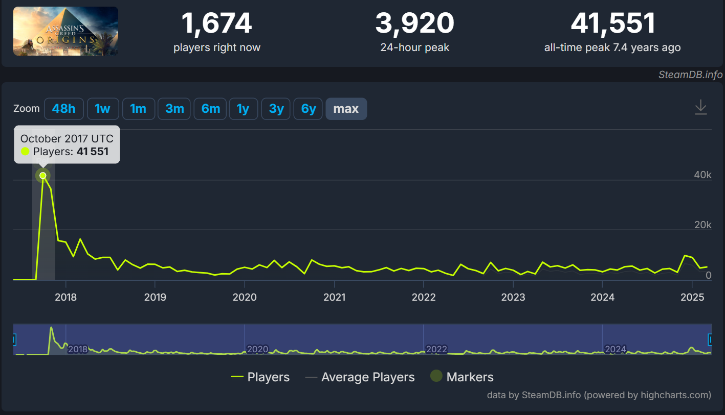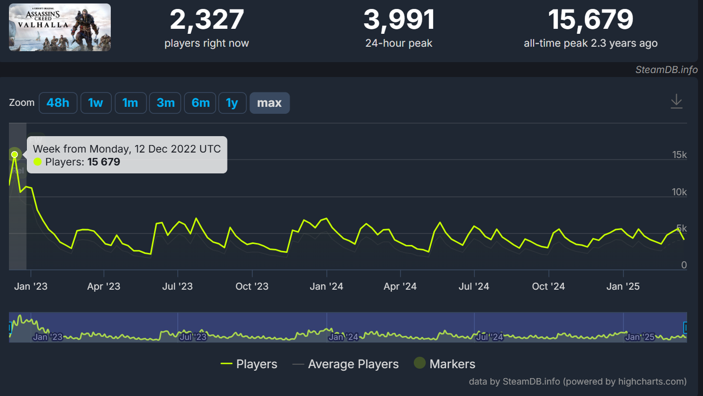 從比較能看出的 Steam 平台數據顯示。在發售後的 24 小時內隨著各區域開放下載遊玩,突破了《刺客教條:維京紀元》的上架成績,第三方 Steam DB 紀錄一度來到 41412 人逼近《刺客教條:起源》的成績,但距離目前系列於 Steam 最高同上紀錄 62069 的《刺客教條:奧德賽》要看發售後的第一個週末尖峰時段,大多單機遊戲新作都能在此決定首波的最好成績紀錄。