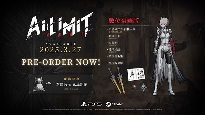 《無限機兵》目前已於 Steam 與 PlayStation5 平台展開預售,並提供限時 10% 折扣優惠。購買預售版本的玩家還可獲得遊戲內限定裝備「女僕裝&花邊頭帶」作為預約特典。