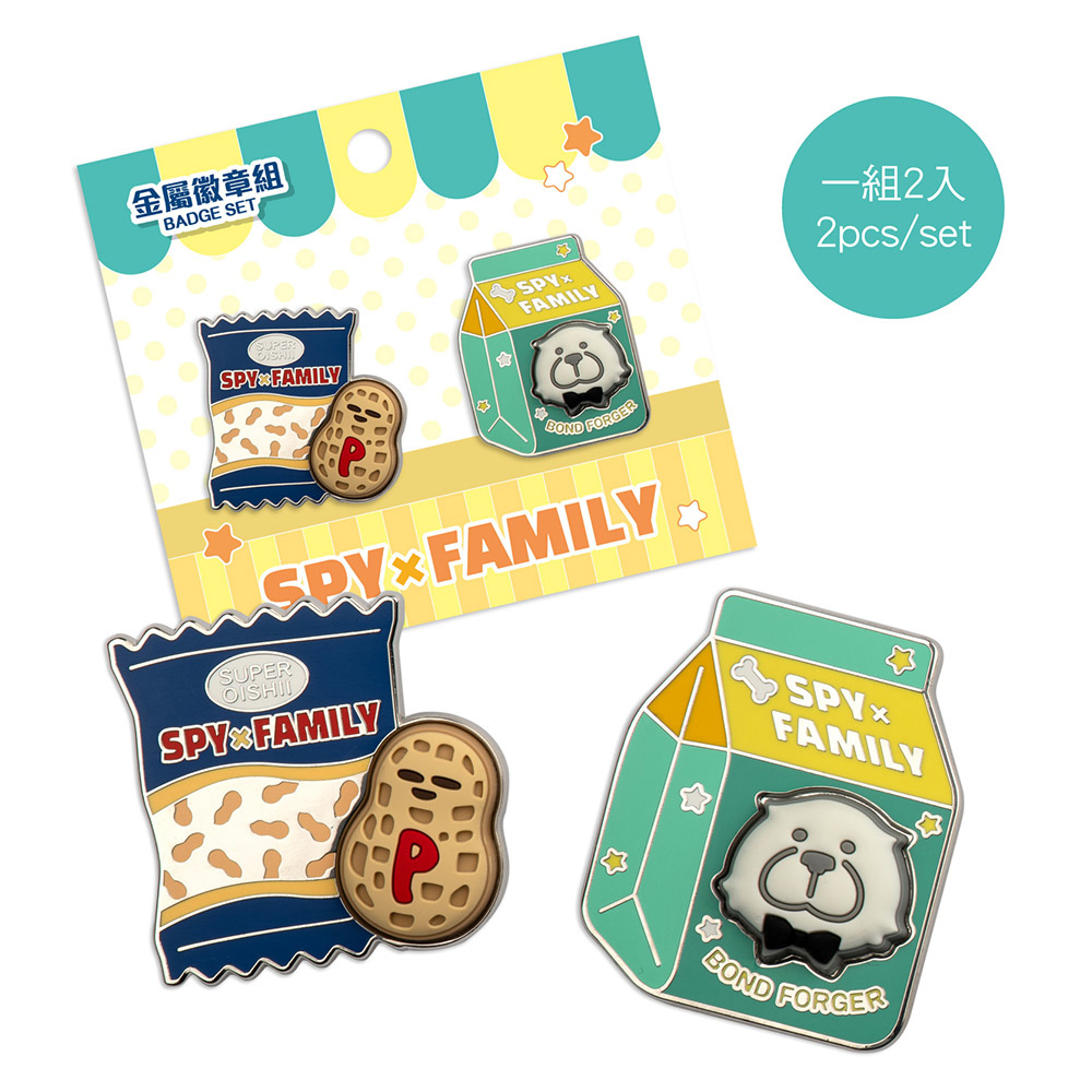 《SPY×FAMILY 間諜家家酒》中人氣超高的彭德與花生,彭德化身飲料盒上的超萌 LOGO,花生與包裝袋同框的可愛模樣,兩入一組的金屬徽章是你療癒生活的好選擇。