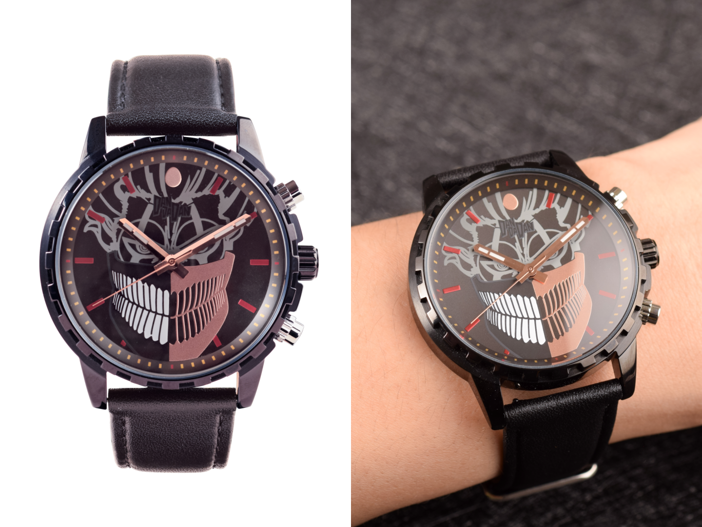 《膽大黨》的厄卡倫手錶,以變身後厄卡倫的面具作為錶面設計主體,雙色拼接加上裱褙雷射,衝擊感與氣勢都超強,12 點鐘的刻度以被高速婆婆靈力膜包覆的金蛋呈現,畫龍點睛地帶出厄卡倫蛋蛋在故事中的重要性。