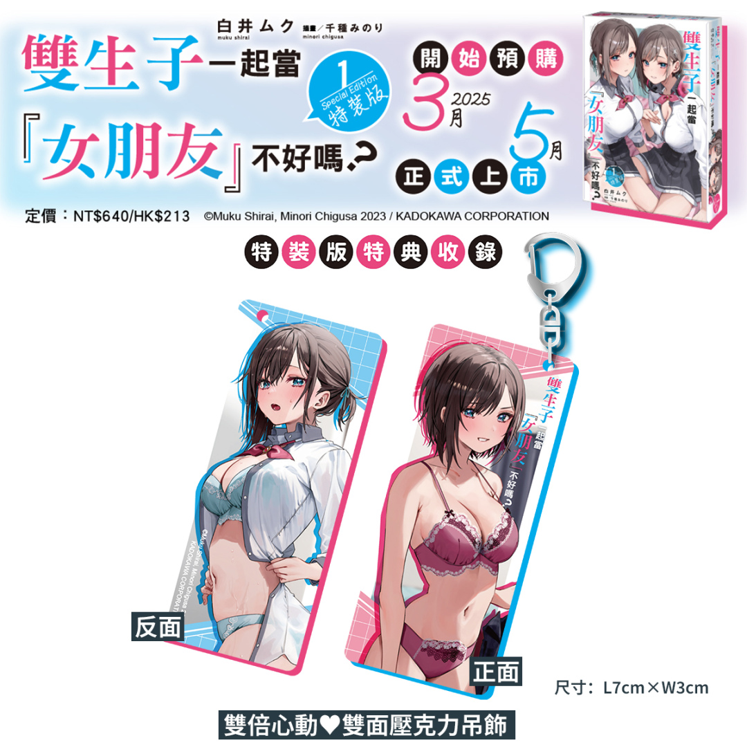 《雙生子一起當「女朋友」不好嗎? (1)》特裝版收錄精美周邊,讓讀者更能沉浸在雙生姊妹花的戀愛世界!除了本集小說 With 特別設計書衣,還有「雙倍心動♥雙面壓克力吊飾」,可愛的宇佐見姊妹一面展現正經乖巧的模樣,一面則是輕鬆奔放的私下姿態,透過這款吊飾一次感受兩種魅力。