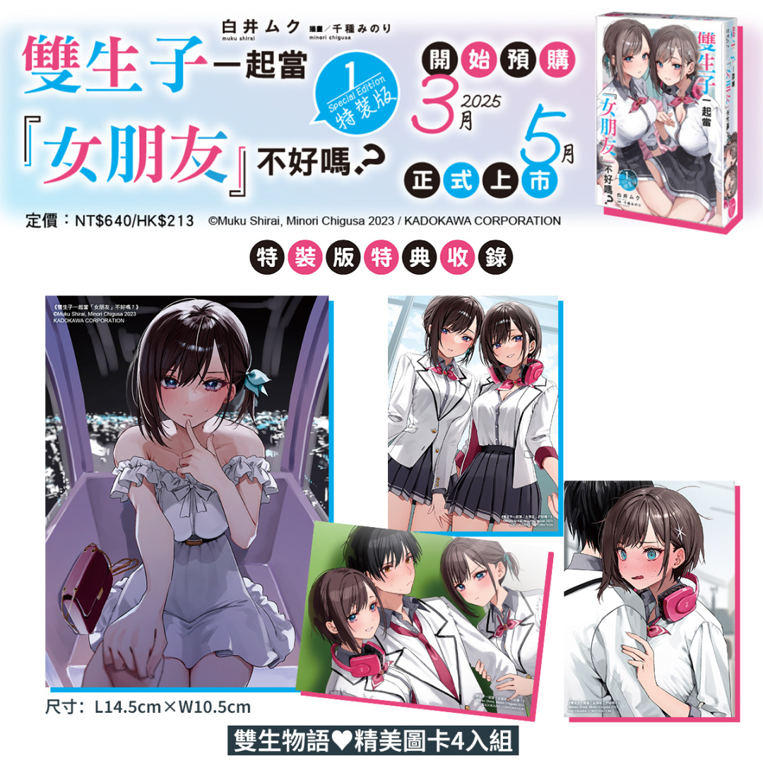 告白也同時成立?而且在兩人的提議之下,沒想到我竟然要和雙方交往?《雙生子一起當「女朋友」不好嗎? (1)》特裝版將於五月在台同步發售!
