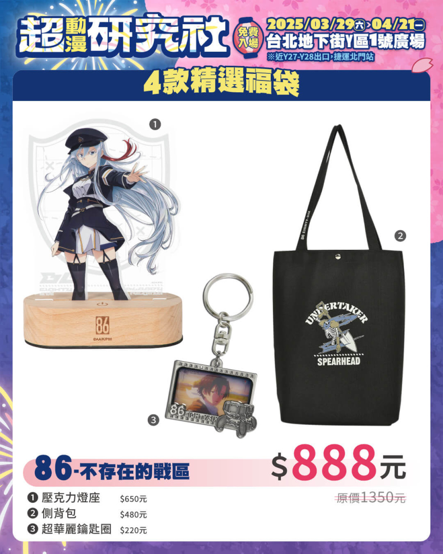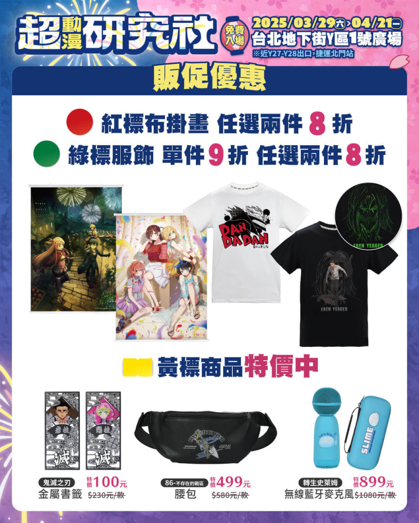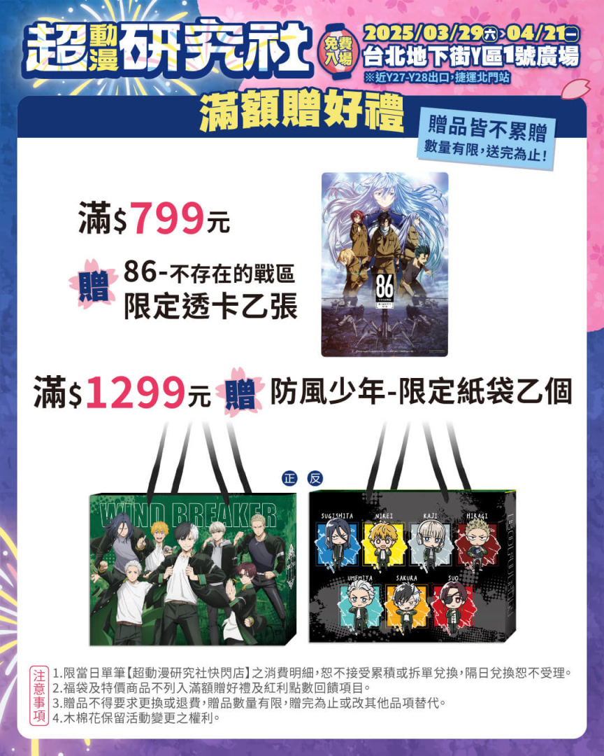 凡持當日於超動漫研究社購買之消費明細,達到指定消費金額即可兌換滿額贈好禮一款,包含 799 元滿額贈《86 -不存在的戰區-》限定透卡、1,299 元贈《WIND BREAKER 防風少年》限定紙袋。贈品皆不累贈,數量有限送完為止。現場還有快閃限定優惠商品包含各式動畫周邊,包含服飾、布掛畫及精品等你來挖寶!