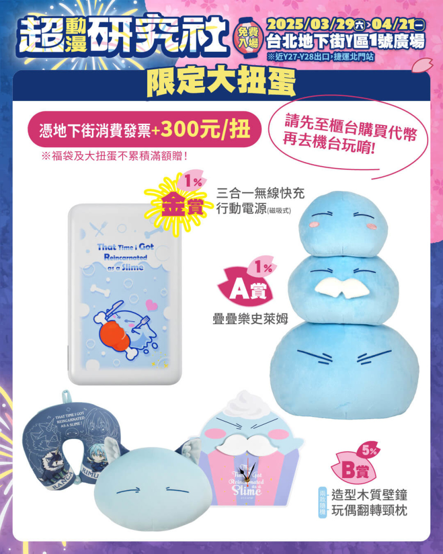 近期因劇場版熱烈引發話題的《劇場版「進擊的巨人」完結篇 THE LAST ATTACK》與《Lycoris Recoil 莉可麗絲》隨機款式相片卡機,每抽 50 元,不同款式相卡等你來蒐集!只要憑台北地下街任一消費發票即可以 300 元兌換代幣扭《關於我轉生成史萊姆這檔事》利姆路的超值周邊一次,數量有限、扭完為止。