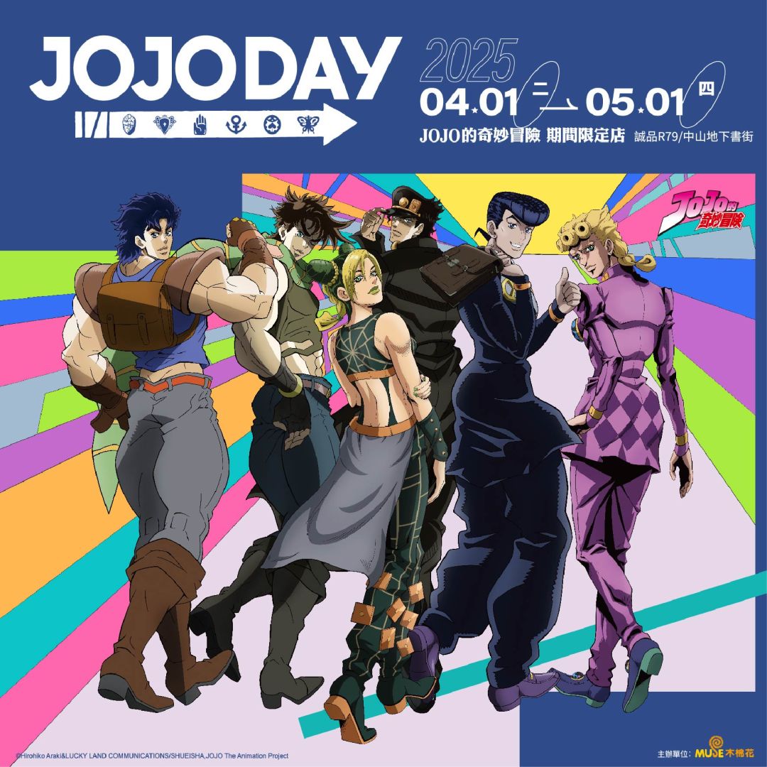 3/29(六)~5/1(四)於誠品 R79/中山地下書街將舉辦 JOJODAY《JOJO的奇妙冒險》期間限定店。5 月 1 日前,憑「超動漫研究社快閃店」消費明細至「JOJODAY《JOJO的奇妙冒險》期間限定店」再次消費,主動出示明細,滿 499 元即可現折 50 元!且憑「JOJODAY《JOJO的奇妙冒險》期間限定店」消費明細至「超動漫研究社快閃店」再次消費,可領取限量小禮一份。