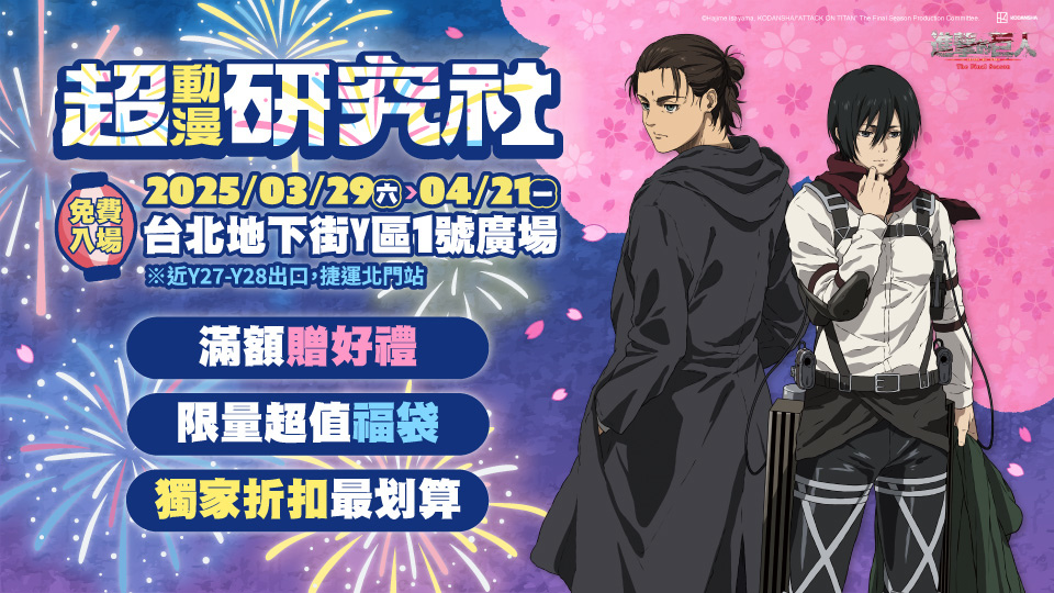台灣動畫代理商木棉花,宣布從 3 月 29 日開始至 4 月 21 日止,將於台北地下街Y區1號廣場舉辦免費入場活動綜合 IP 作品快閃店「超動漫研究社」。