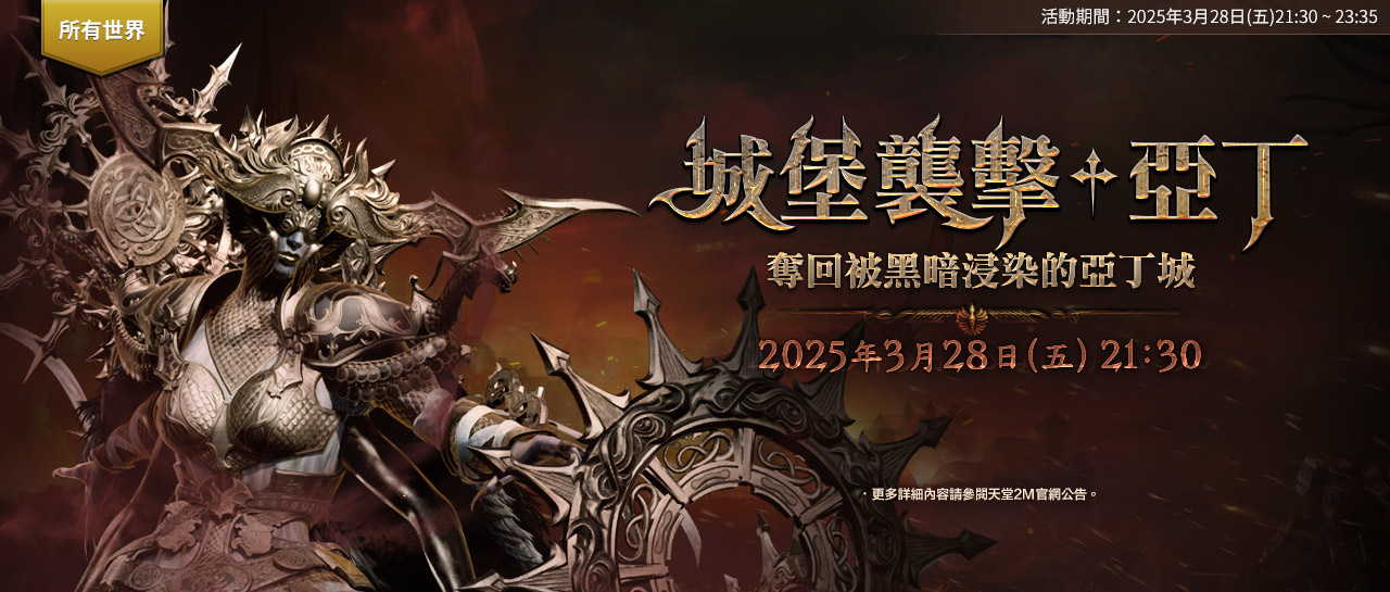 此次更新所有世界將共同進行「城堡襲擊:亞丁」活動,3/28(五)21:30~23:35,於可入場時間內,繼承者可透過選單→副本→普通→亞丁攻城戰(活動)入場。