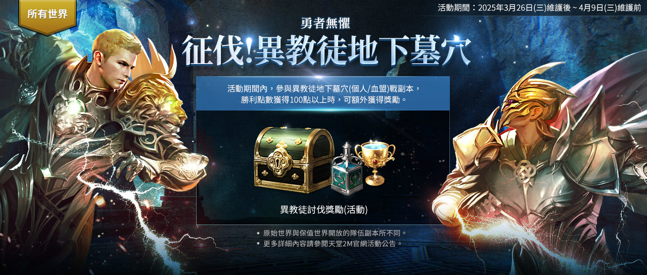 .所有世界「征伐!異教徒地下墓穴」:3/26 維護後~4/9 維護前,活動期間內,參與異教徒地下墓穴(個人/血盟)戰副本,勝利點數獲得 100 點以上時,可額外獲得「異教徒討伐獎勵(活動)」。