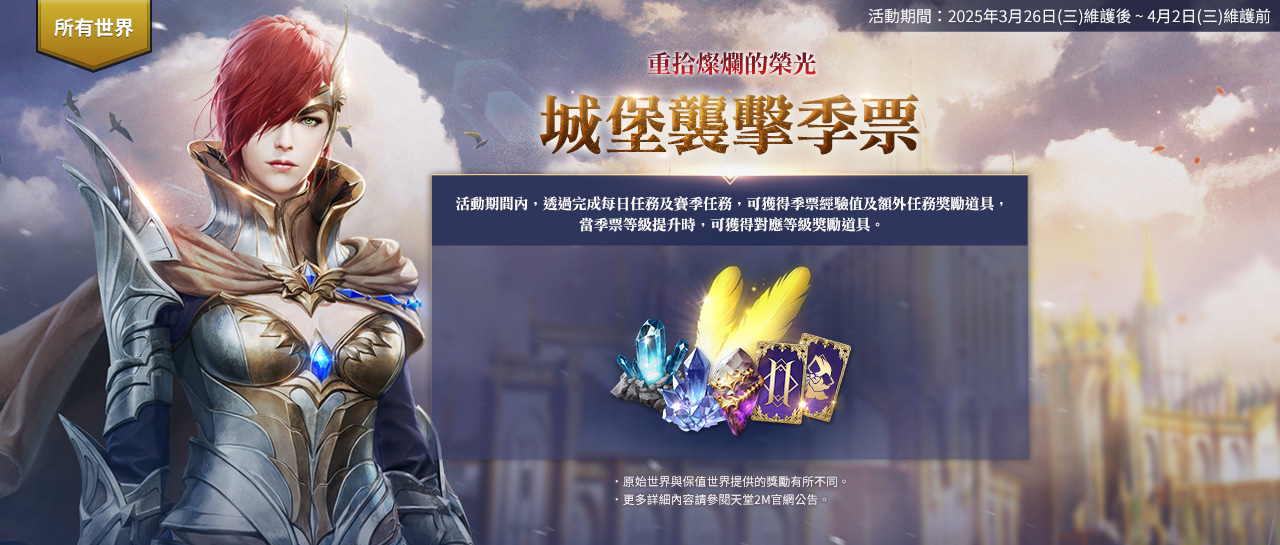 .所有世界「城堡襲擊季票」:3/26 維護後~4/2 維護前,活動期間內,透過完成每日任務及賽季任務,可獲得季票經驗值及額外任務獎勵道具,當季票等級提升時,可獲得對應等級獎勵道具。