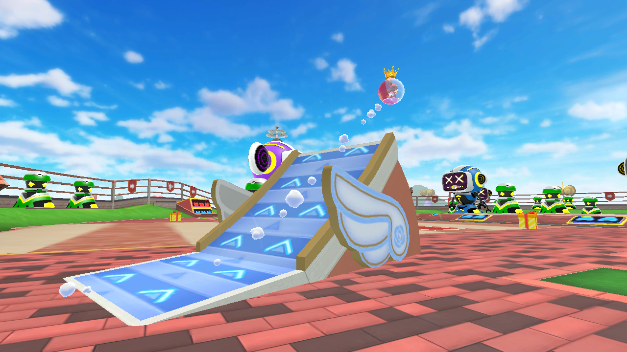 此關卡是一座瀰漫花香的空中庭園。用跳出來的櫃子和傳送帶的發射台,華麗地打倒用滑行板移動的巨大機器人吧!