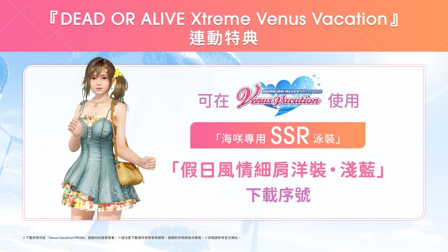 以及,同為系列作品正於 Steam 營運中的度假遊戲《DEAD OR ALIVE Xtreme Venus Vacation》,現正舉辦紀念本作發售的合作活動。在本次活動中,玩家可以獲得合作紀念比基尼泳裝,以及繪製的《Venus Vacation PRISM》視覺圖的海報傢俱。在合作活動中,另有紀念合作的看板任務,完成看板任務即可獲得印有《Venus Vacation PRISM》視覺圖的裝飾寫真。