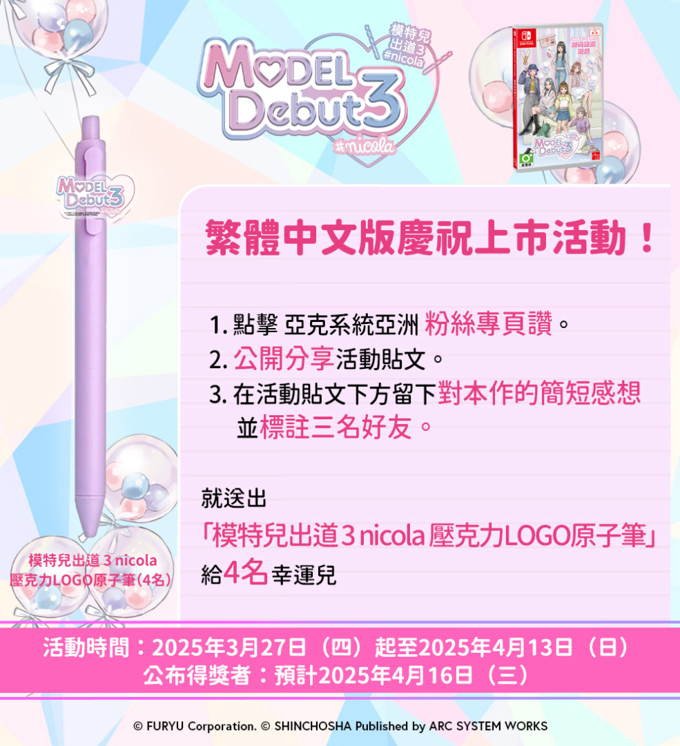 亞克系統亞洲 Arc System Works Asia 宣布,Furyu 開發的模特兒模擬遊戲《MODEL Debut 3 #nicola/模特兒出道 3 nicola》Nintendo Switch 繁體中文版今日上市,並舉辦慶祝上市活動。