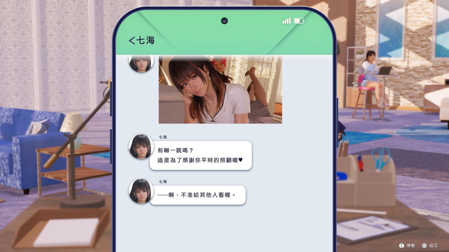 此外本作隨著章節中間會有一些角色使用及時通訊的對話,還有此穿插腹肌訓練、肌力挑戰、大繩跳等小遊戲,作為休閒橋段也能加深角色好感度,演出上可以說幾乎都在呈現與玩家的「心跳真愛距離」。甚至是維納斯香汗淋漓的瞬間,也透過新引擎呈現,