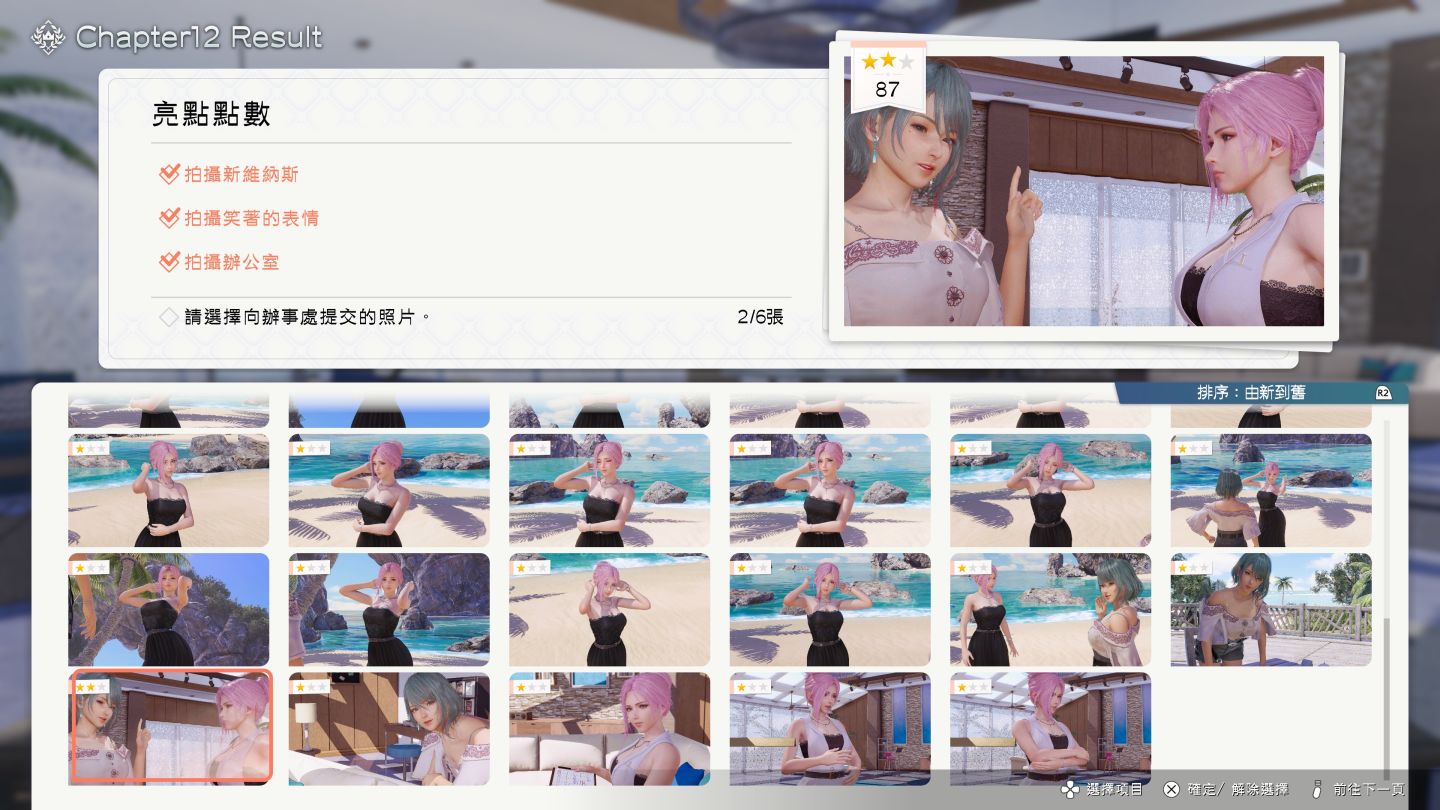 本次遊玩使用的是 Steam 版本,拍攝功能將會自動啟動 Steam 截圖帶有商標的圖案,有時候可能還是用 Steam 內建截圖的畫面較為乾淨許多,玩本作最大的特色就是通關完一輪,你的截圖數量也隨之暴增,首先每章節皆包含指定拍攝任務,需完成特定主題或構圖獲得積分,但是積分的評比其實有點令人捉摸不清,可是絕大多數的角色人氣、解鎖新服裝與分支劇情都得靠這完成。