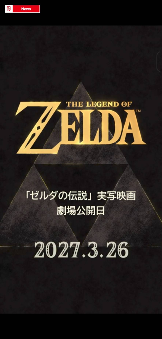 任天堂於行動裝置應用程式 「Nintendo Today!」 揭露《薩爾達傳說》真人版電影將於 2027 年 3 月 26 日全球上映。