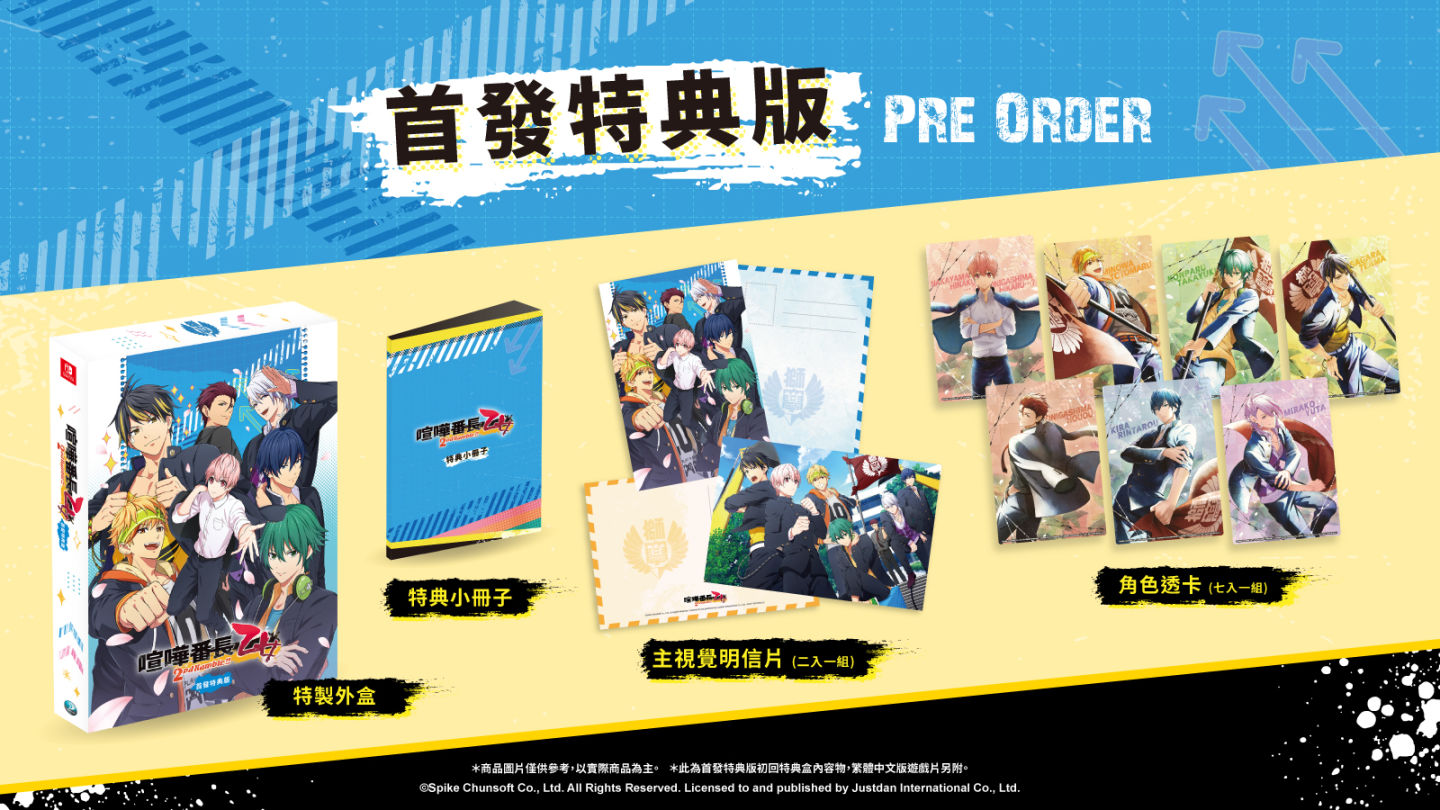 本次《喧嘩番長 乙女 2nd Rumble!!》首批實體版本,均將免費升級為「首發特典版」。內容除了角色透卡(七入一組)、主視覺明信片(兩入一組)之外,還包含中文版獨家的全彩特典小冊子,內容收錄主視覺插畫、角色設定以及精美 CG 圖並完整中文化。再次回到獅子吼高中,與熟悉的夥伴們展開新學年生活吧!