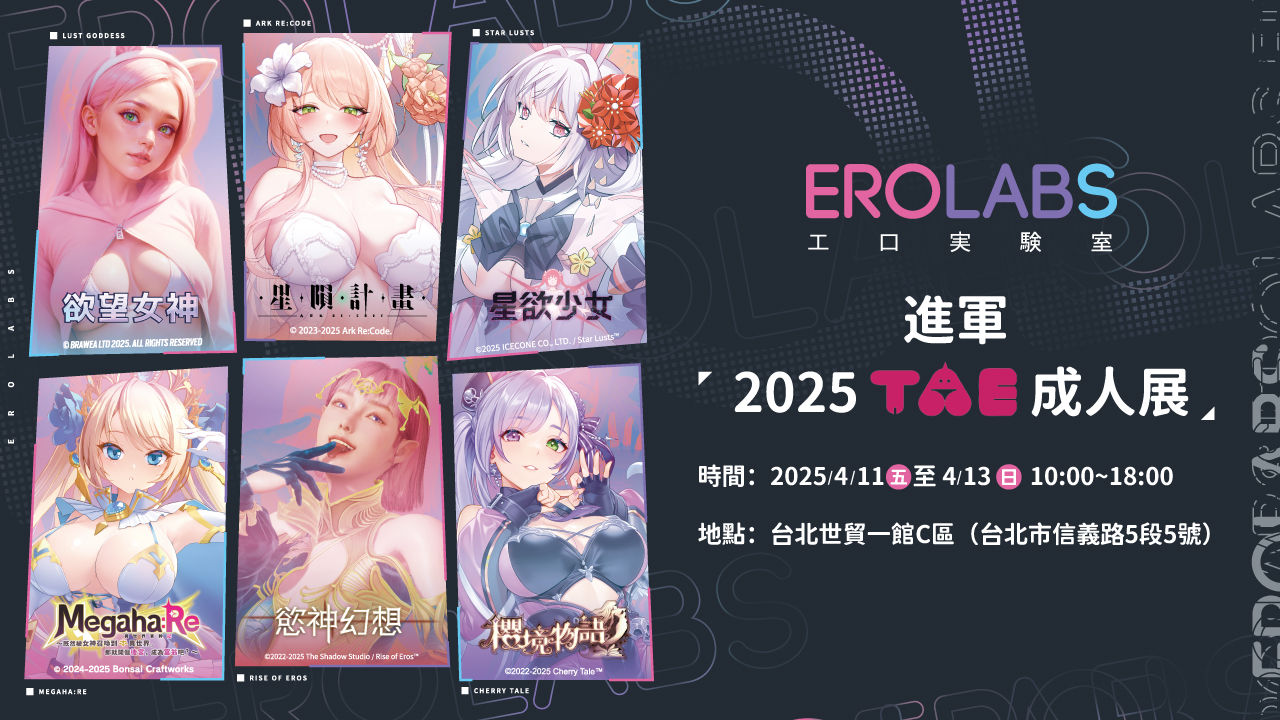最色色的遊戲,就要在最色色的地方出現!《星欲少女》即將於 4 月 11 日至 4 月 13 日上午 10 時至晚間 6 時前進「2025 TAE 台灣成人博覽會」台北世貿一館C區「工口實驗室 EROLABS」攤位,坐等指揮官親臨現場「調教」,邀請玩家們和機工少女們進行最心跳加速、最刺激感官的互動體驗,準備好你的時間,與機甲少女們在 TAE 相見!