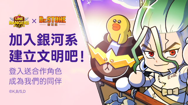 合作活動期間,「石神千空」、「淺霧幻」、「七海龍水」、「Dr.賽諾」、「史丹利」將做為合作限定 Rangers 登場之外,同時還有以《Dr.STONE 新石紀》常見物品為造型的合作裝備同步開跑!另外,只要在合作活動期間,登入《LINE Rangers 銀河特攻隊》就可獲得限定合作 Ranger「七海龍水」。