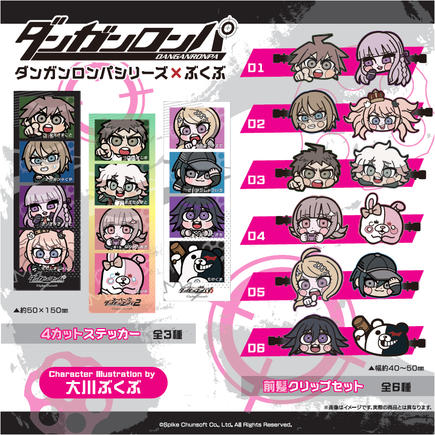 此次合作是由搞笑四格漫畫《POP TEAM EPIC》的作者「大川 bkub」所繪製,包含了黑白熊、黑白美、苗木誠、霧切響子、日向創、七海千秋、赤松楓等多位槍彈辯駁系列的人氣角色,並推出壓克力鑰匙圈、徽章、四格直立貼紙、髮夾等多樣商品,請喜愛《槍彈辯駁》的粉絲們切勿錯過!