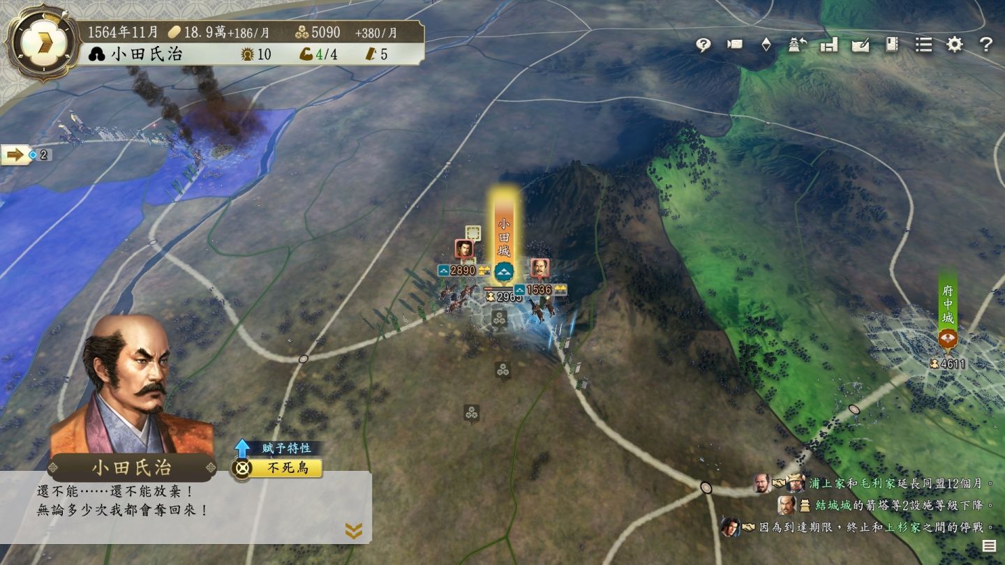 同時,成為大名的左右手,讓家臣更具特色的「評定眾」,以及勢力發展的指針「勢力目標」,都能決定勢力整體的方向。此外,還有可設定城的各自用途的「城用途」,以及全國各地具有強大效果的戰略要地「名勝」等要素。如何擬定作戰計畫並在單一地圖上下達指令變得更為重要。