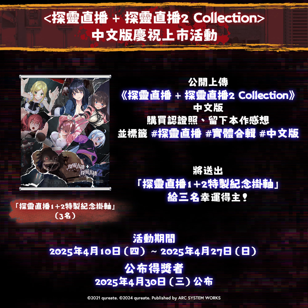 為慶祝《探靈直播 + 探靈直播2 Collection》中文實體盒裝版上市,從今天起舉辦抽獎活動。公開上傳購買認證照並留下關於本作的感想,就有機會得到「探靈直播1+2特製紀念掛軸」。抽獎活動詳情如下:
