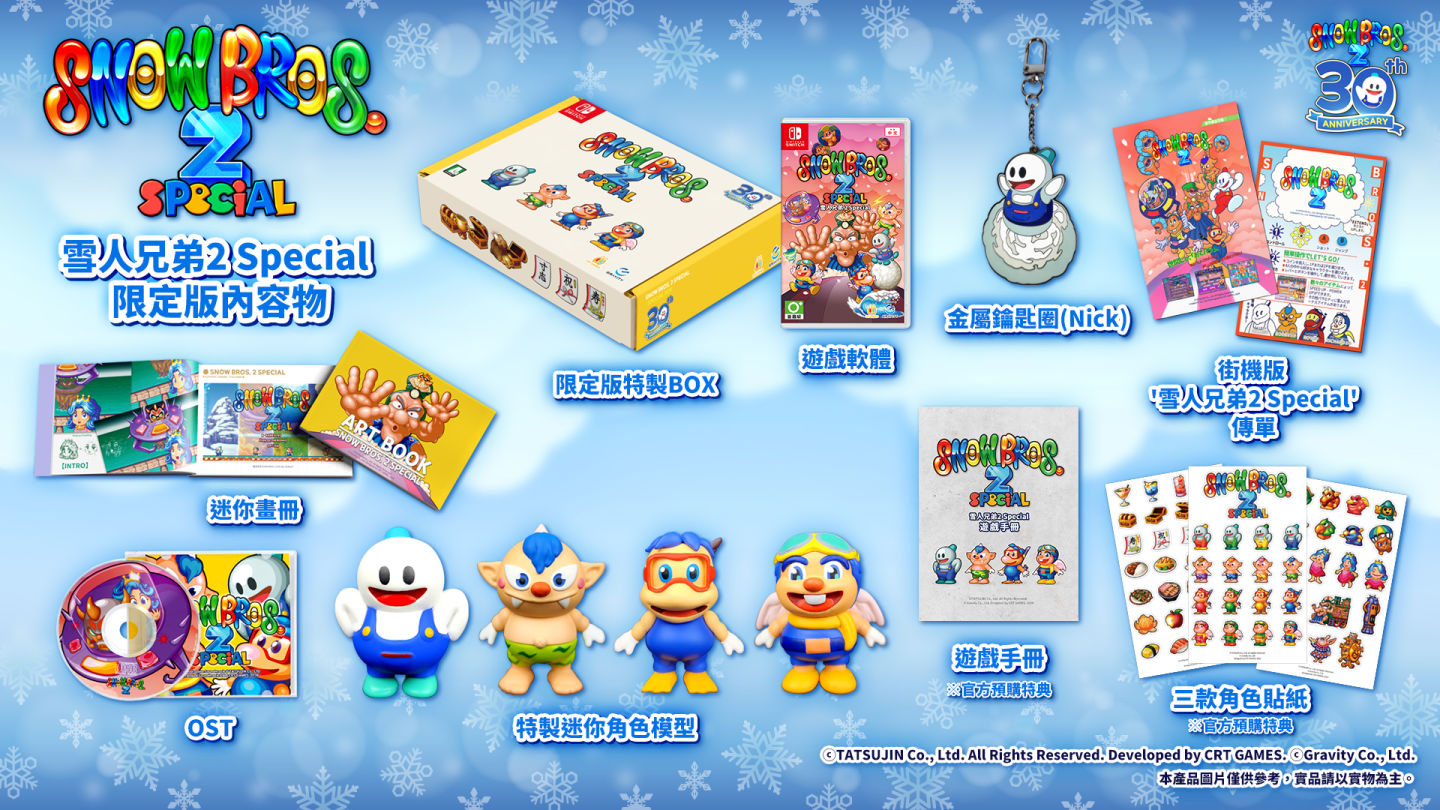 本次《雪人兄弟2 Special》除了一般版之外,也同步推出包含豐富內容的限定版,滿足系列玩家的收藏慾望,喜愛《雪人兄弟》系列的玩家絕對不能錯過這次機會!