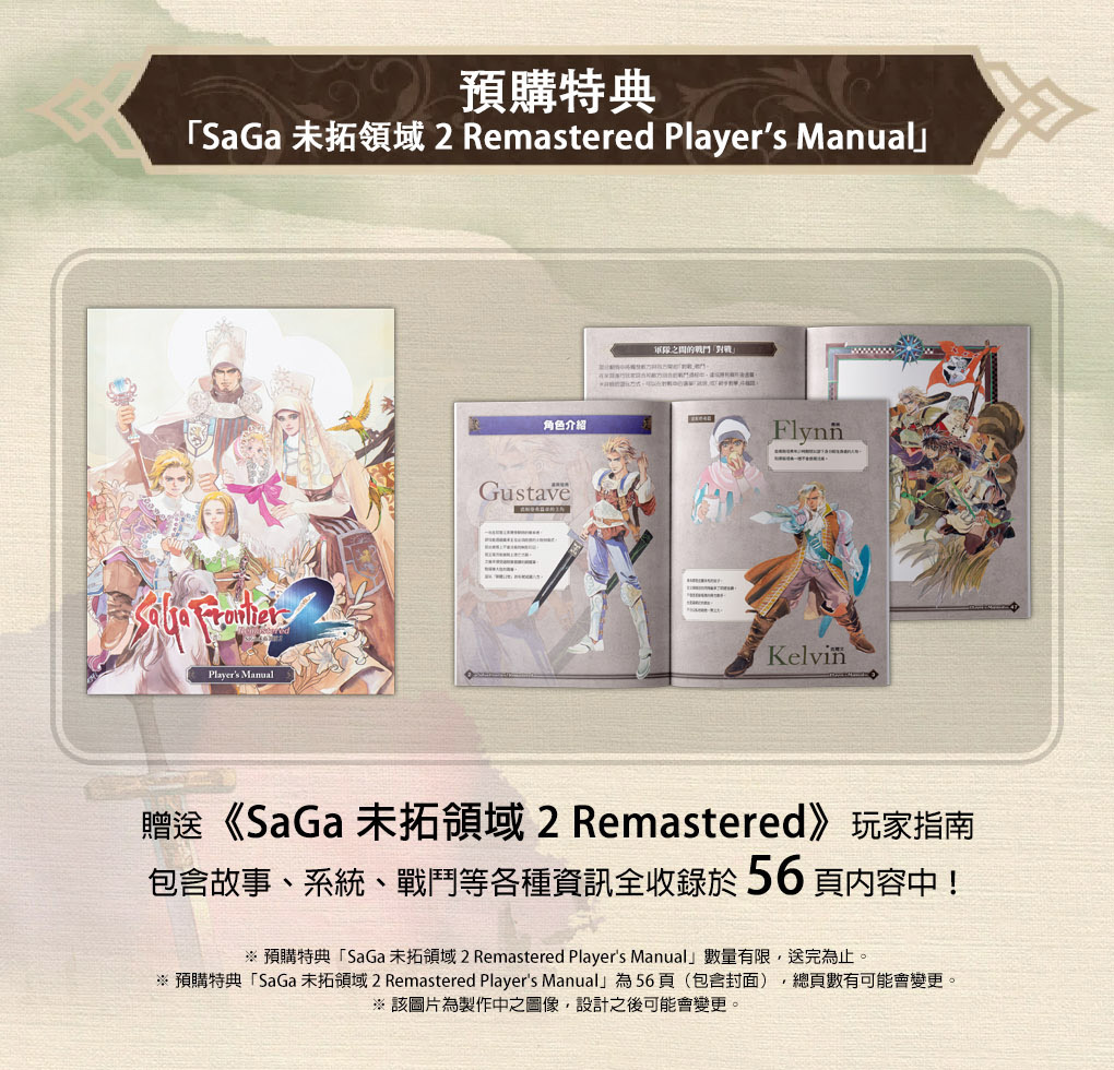 《SaGa 未拓領域2 Remastered》繁體中文實體盒裝版目前正於各遊戲店家的實體及網路商店進行預售。預購《SaGa 未拓領域2 Remastered》繁體中文實體盒裝版就送「SaGa 未拓領域2 Remastered Player's Manual」。