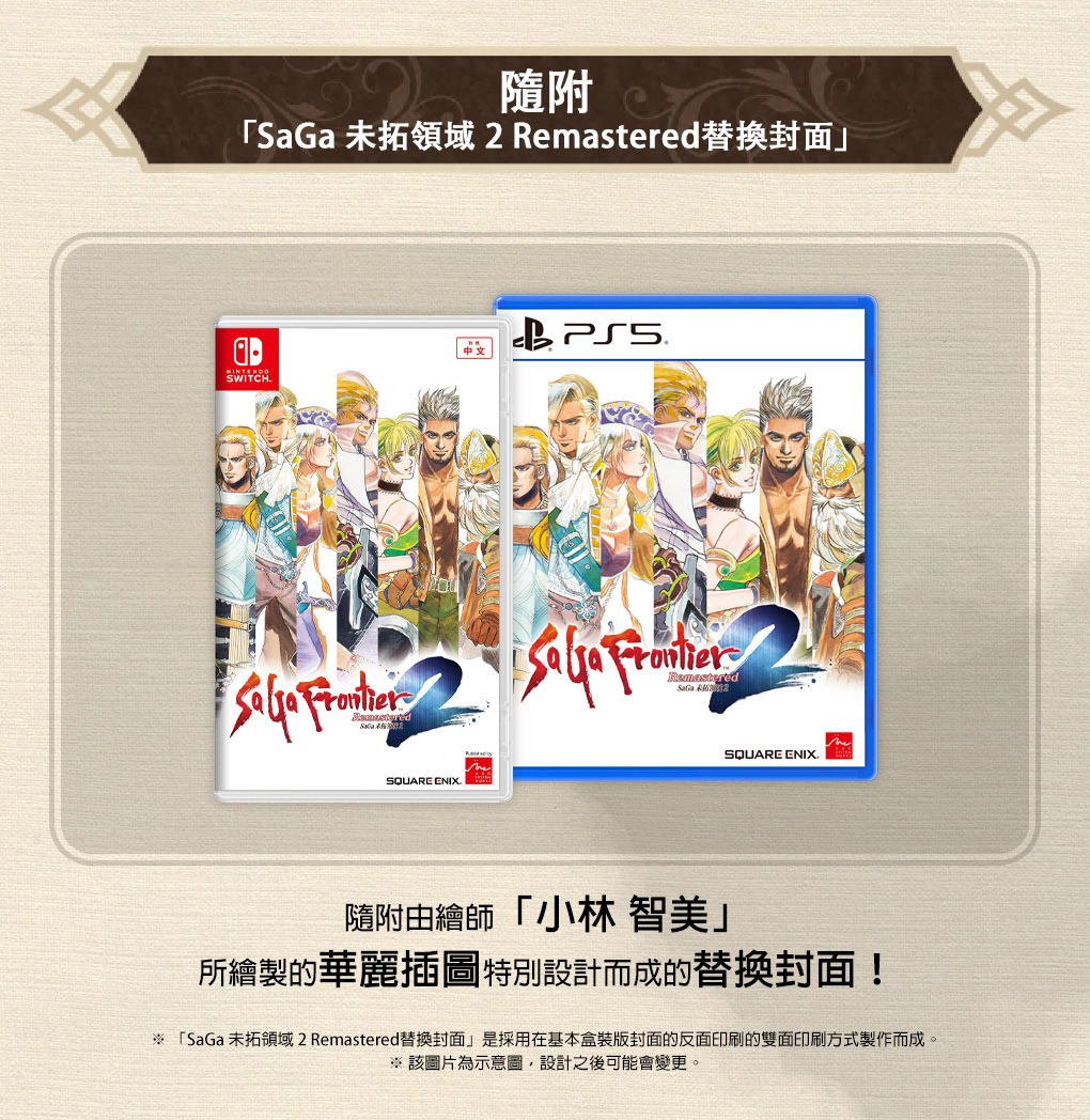 《SaGa 未拓領域2 Remastered》繁體中文實體盒裝版隨附「SaGa Frontier 2 Remastered 替換封面」,該封面以主要角色插圖特別設計而成,購買實體盒裝版的玩家可以選擇自己喜歡的款式來裝飾封面。