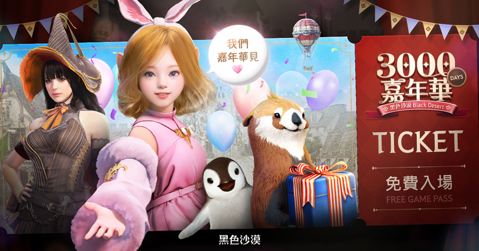 《黑色沙漠》自 2017 年正式於台港澳地區開服營運,並於今年度 4 月份達成 3000 天里程碑,為紀念與冒險家共同走過的旅程與應援往後的冒險,推出「3000天嘉年華」專屬系列活動。