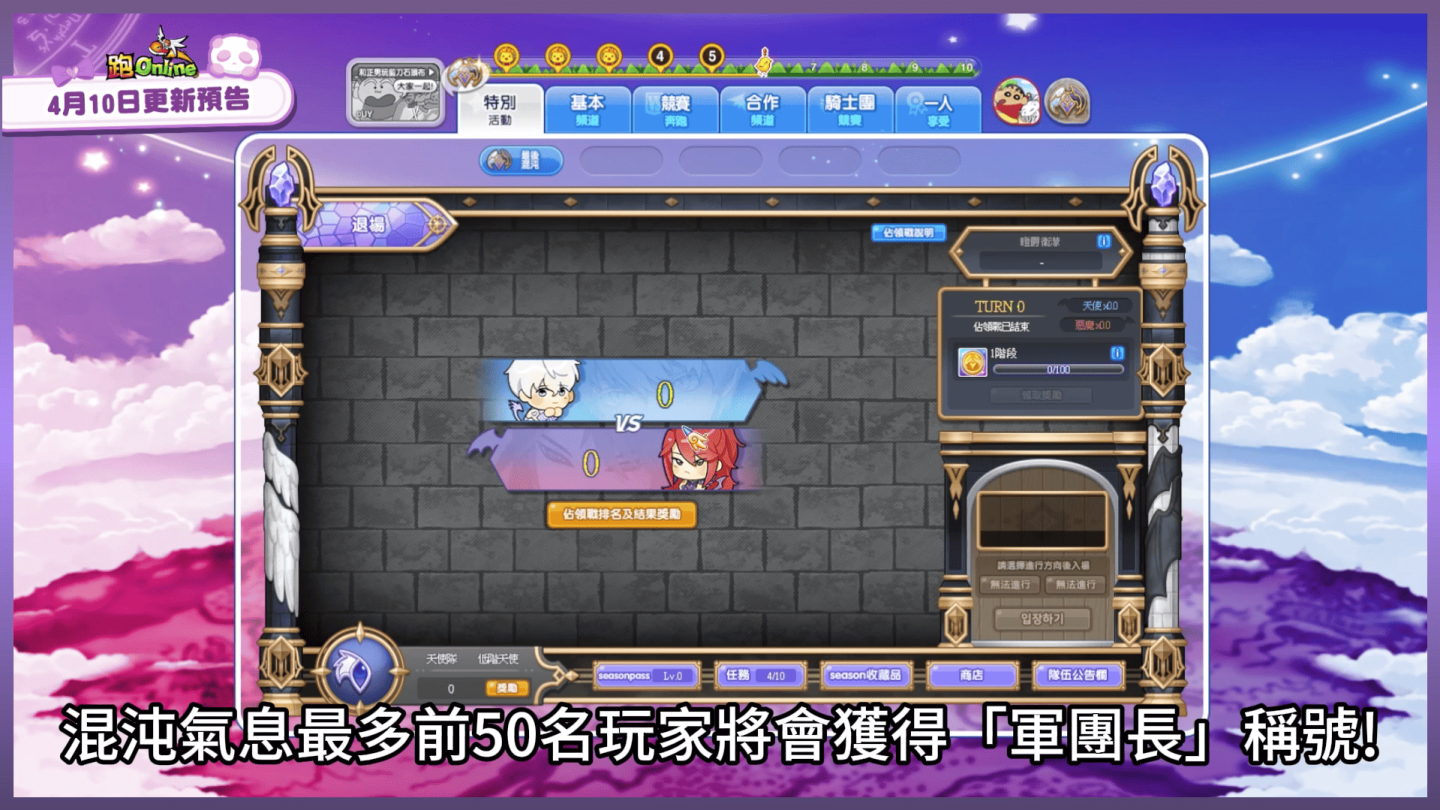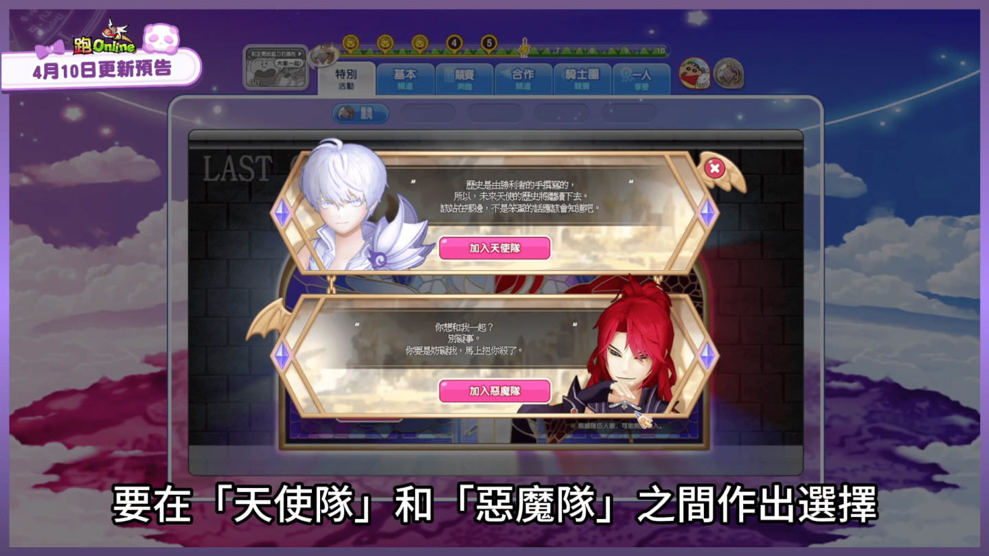故事從夏魯的昏迷開始。願望之石碎裂,時空裂縫撕開了通往混沌戰爭的入口。跑者們,你準備好了嗎?進入「最後的混沌」頻道的第一步,便是做出命運的抉擇——加入守護光明的「天使隊」,還是擁抱黑暗的「惡魔隊」?無論選擇哪一方,專屬獎勵即刻到手;若隨機加入,更有額外寶藏等你開啟!
