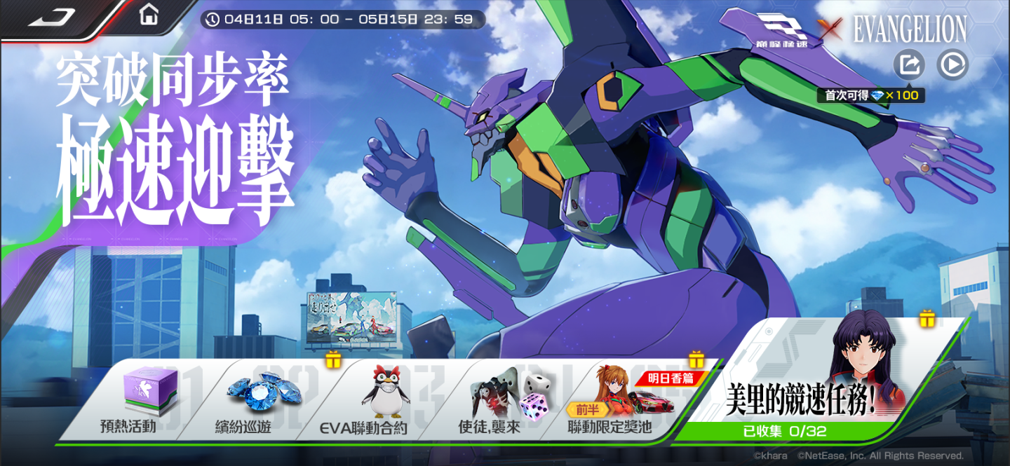 活動期間,還將舉行與初號機一起提高「同步率」的任務!和初號機並肩疾馳,完成任務獲得豐富獎勵和大量鑽石。參與美里的競速任務,收集 NERV 徽章,還可以獲得傳說金車、聯動限定角色美里!解鎖聯動限定合約,還可以獲得夥伴片片,陪伴各位車手開啟狂飆之旅!