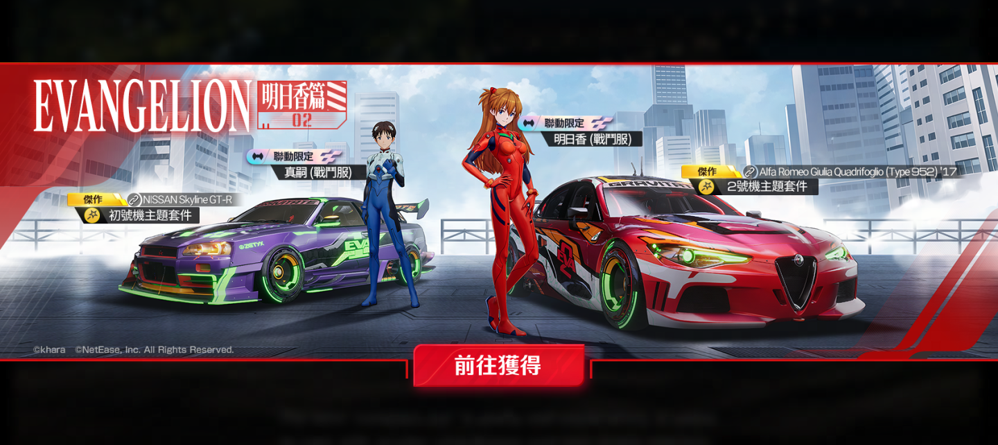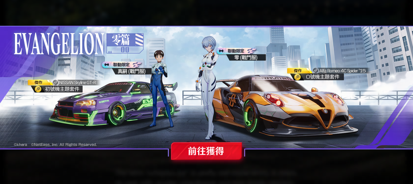 車手們敲碗已久的聯動限定套件也將在活動期間限時登場!日產 Skyline GT-R(R34)'99 初號機套件、Alfa Romeo Gulia Quadrifoglio '17 2號機套件、Alfa Romeo 4C Spider '15 零號機套件,帶你感受如同駕駛 EVA 一般的極致享受!其中,零號機套件將於 2025 年 4 月 28 日(週一)上線,敬請期待!